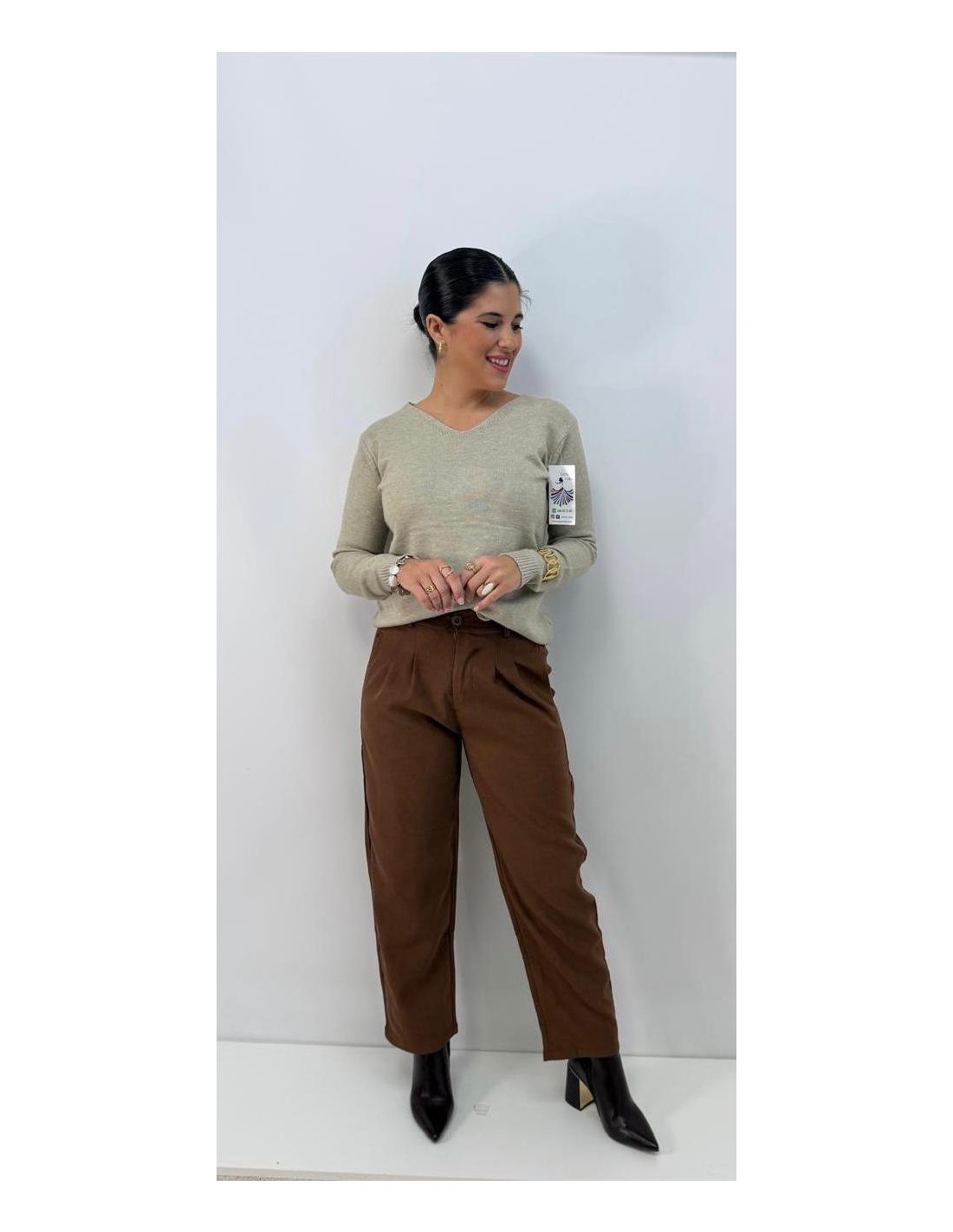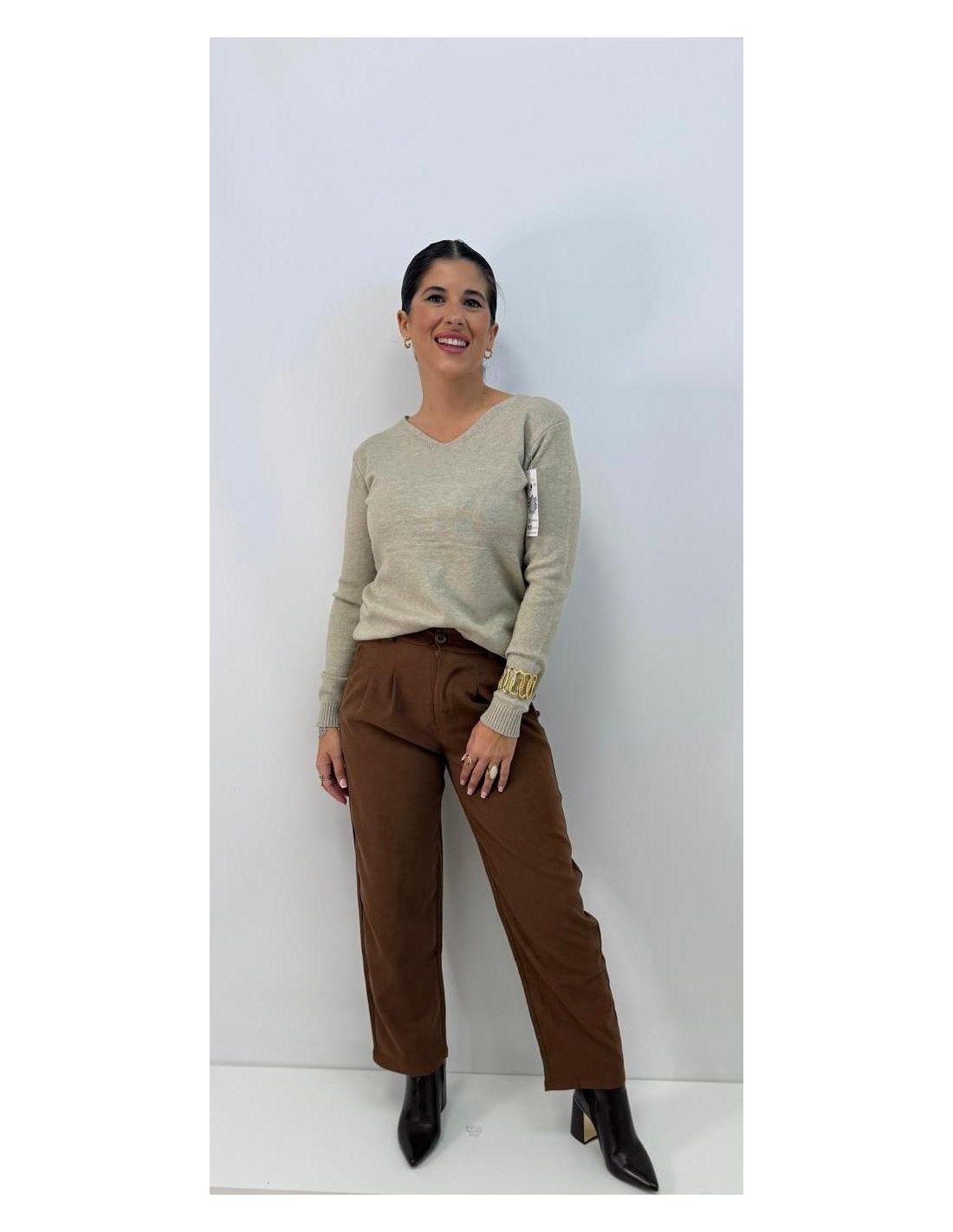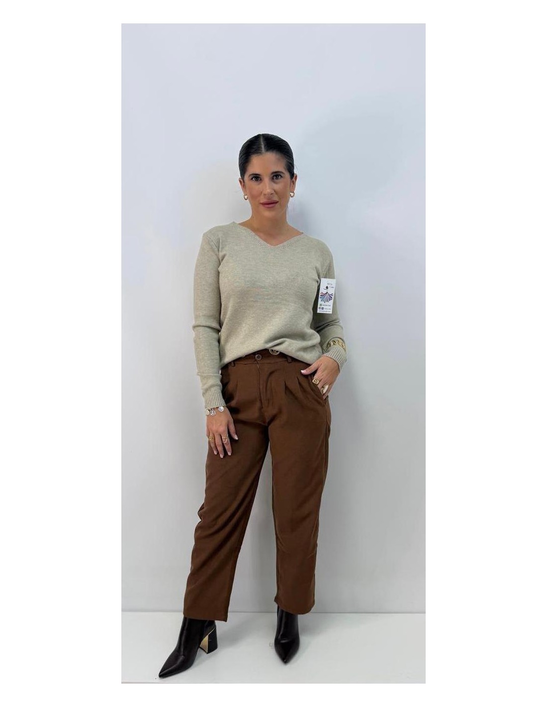 De cuello de pico, de punto, mangas largas. Su talla va desde una 36 hasta una 42-44 aproximadamente.