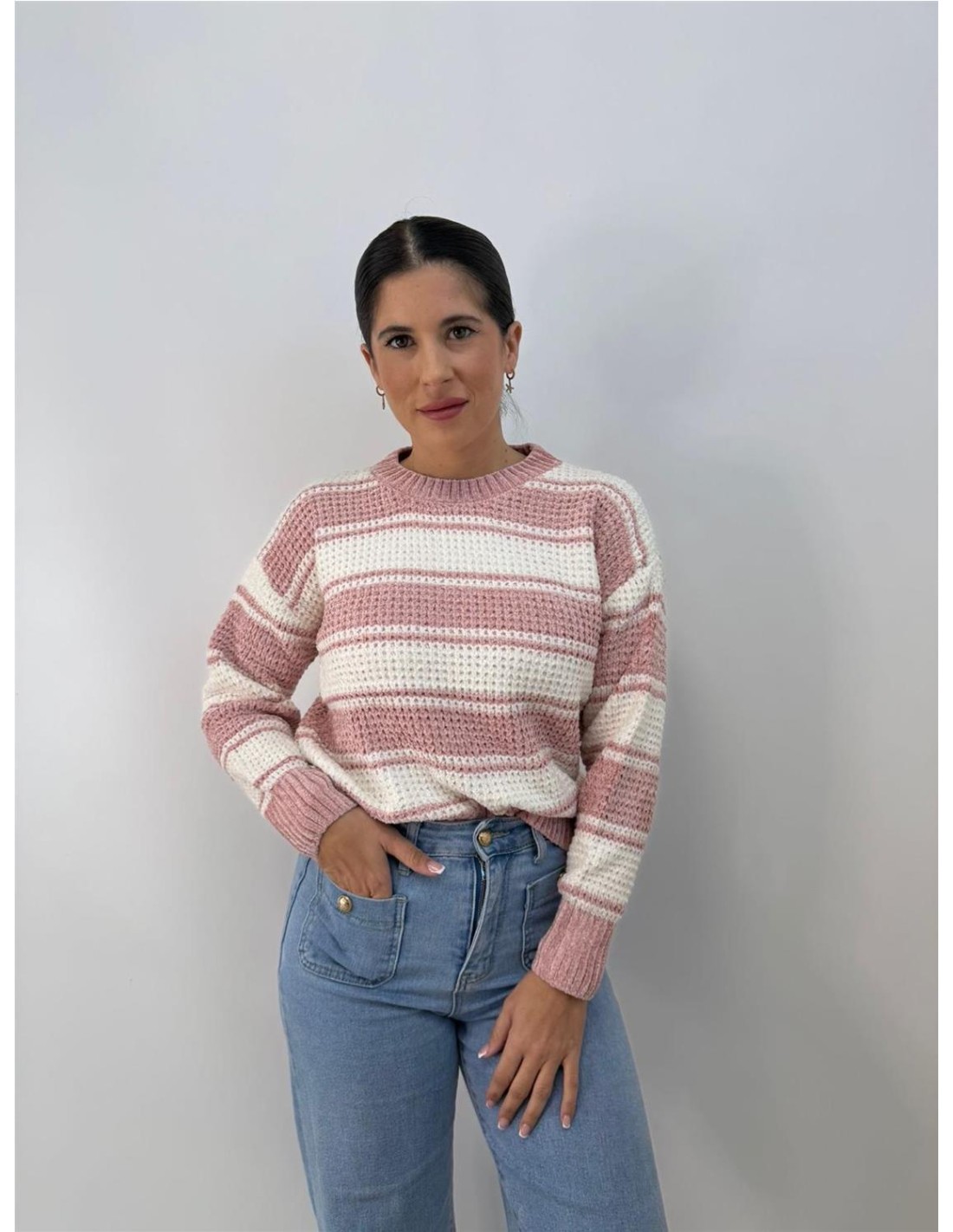 De chinilla, cortito, con rayas, mangas largas. Su talla va desde una 34 hasta una 42 aproximadamente.