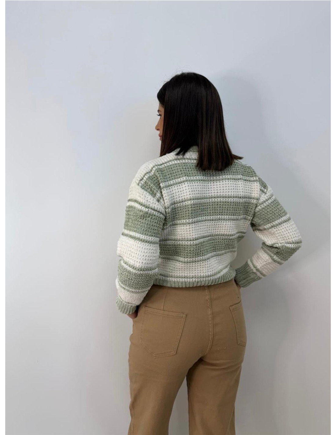 De chinilla, cortito, con rayas, mangas largas. Su talla va desde una 34 hasta una 42 aproximadamente.