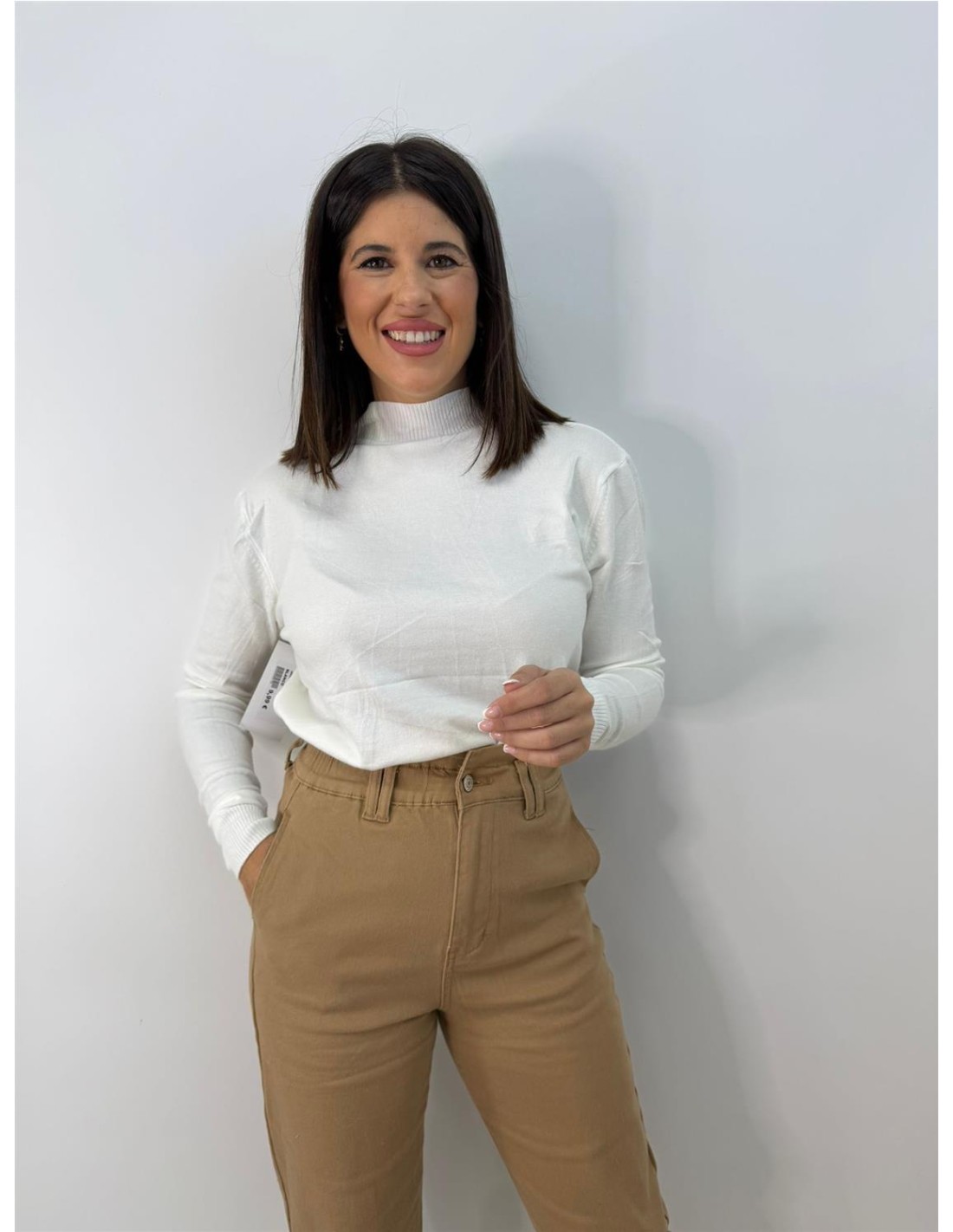 De punto, cuello semi sinney, mangas largas. Su talla va desde una 34 hasta una 44 aproximadamente.