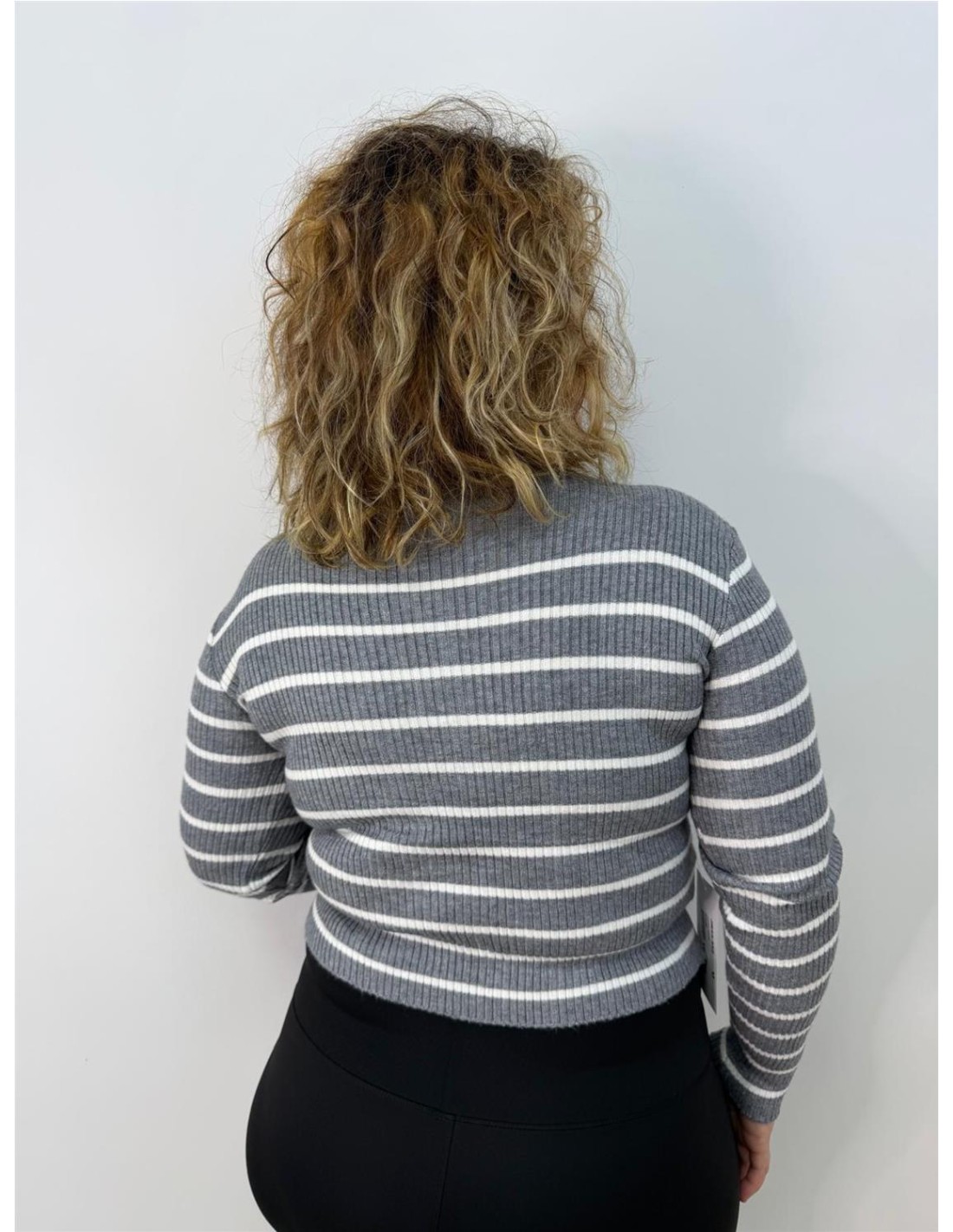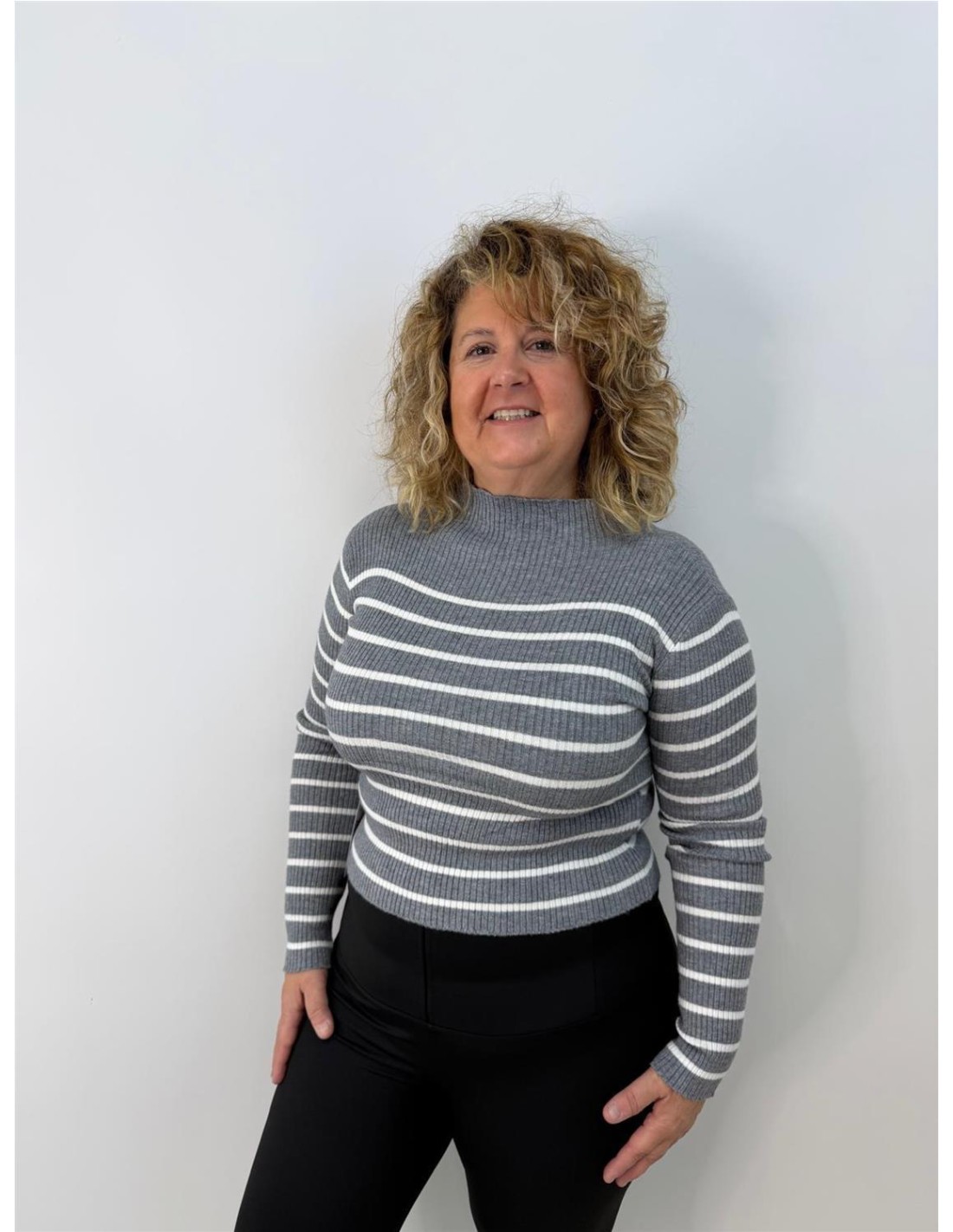 De canale, cuello semi de rayas. Su tallla va desde una 34 hasta una 42 aproximadamente.