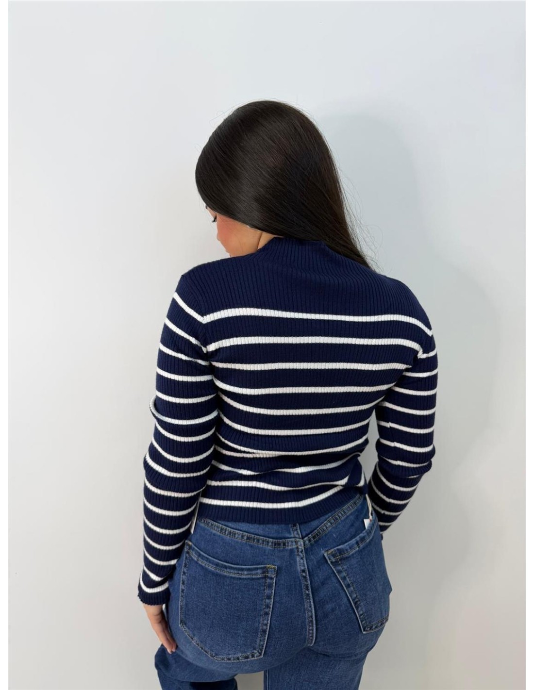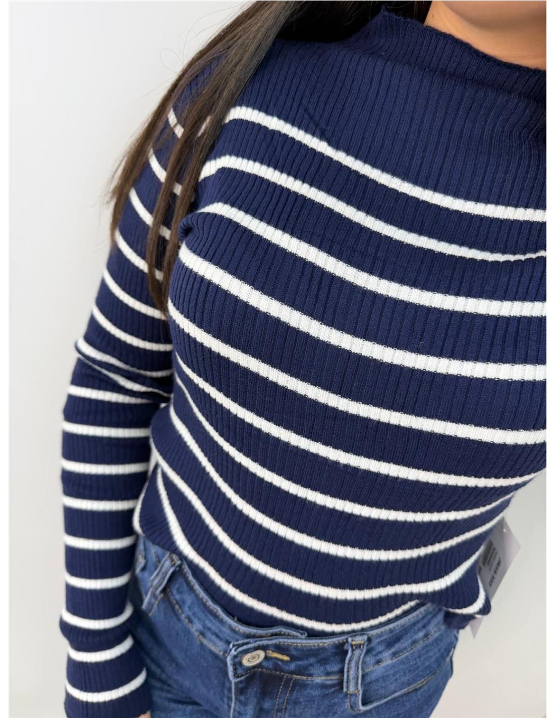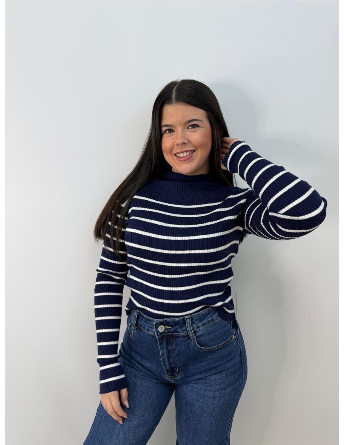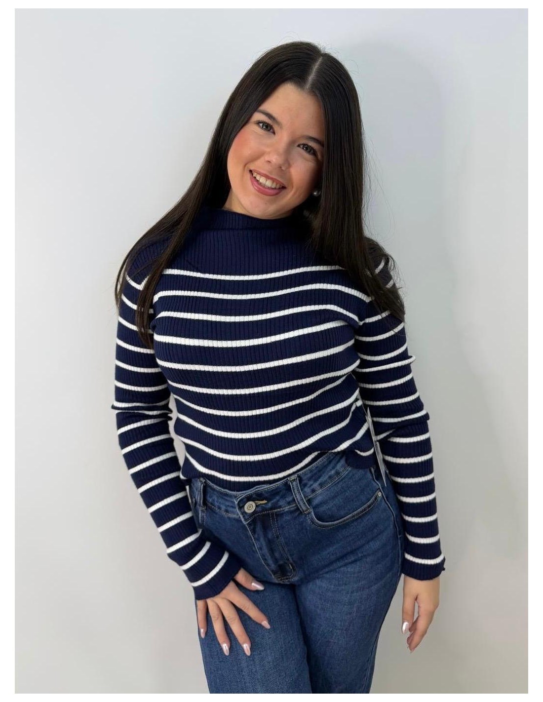 De canale, cuello semi de rayas. Su tallla va desde una 34 hasta una 42 aproximadamente.