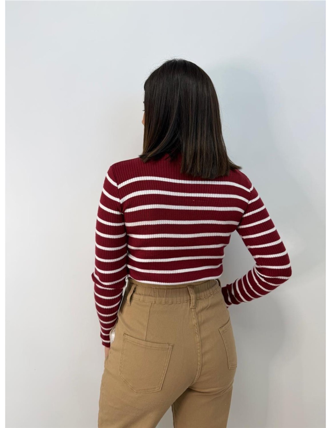 De canale, cuello semi de rayas. Su tallla va desde una 34 hasta una 42 aproximadamente.