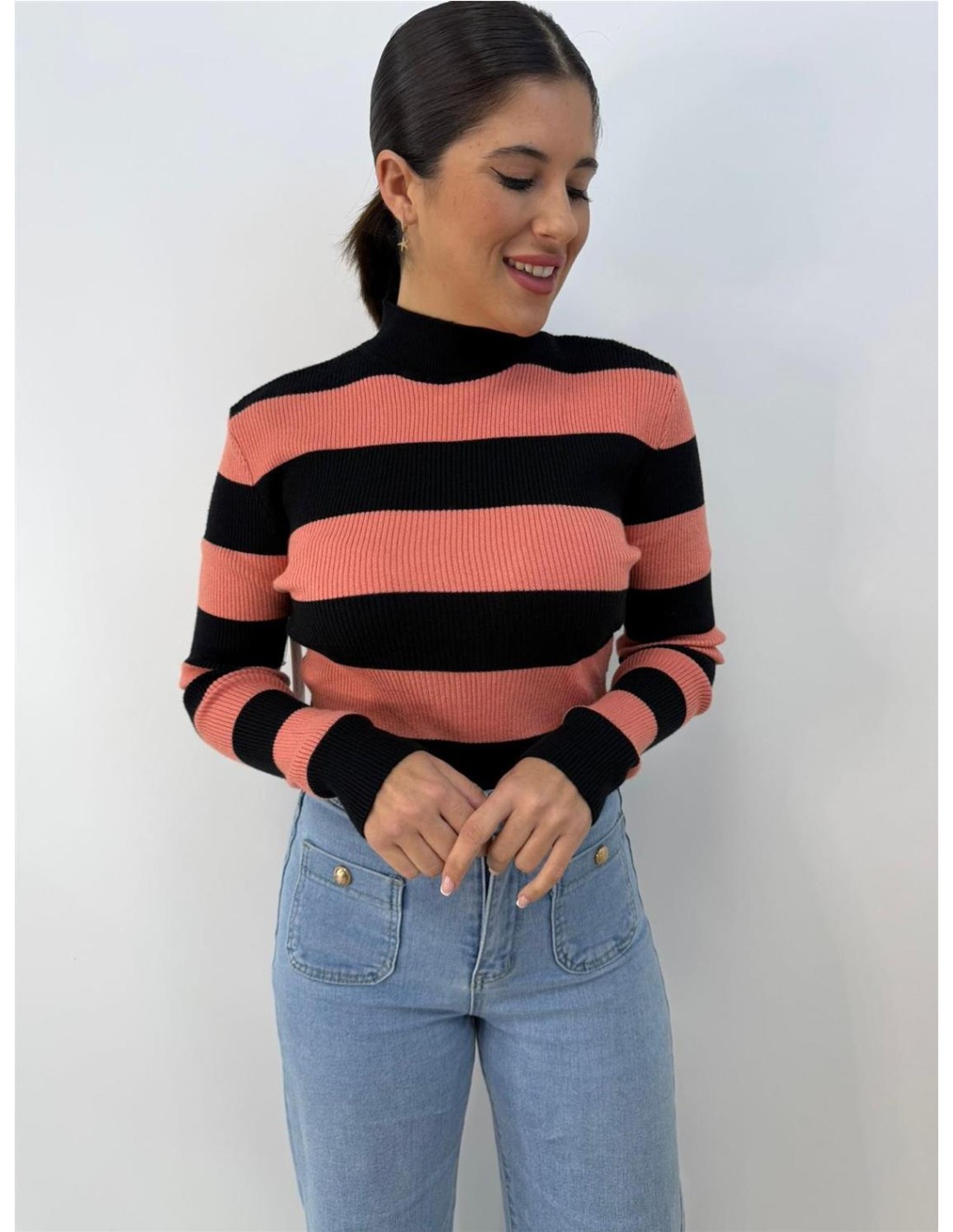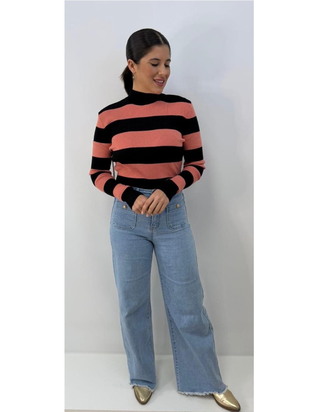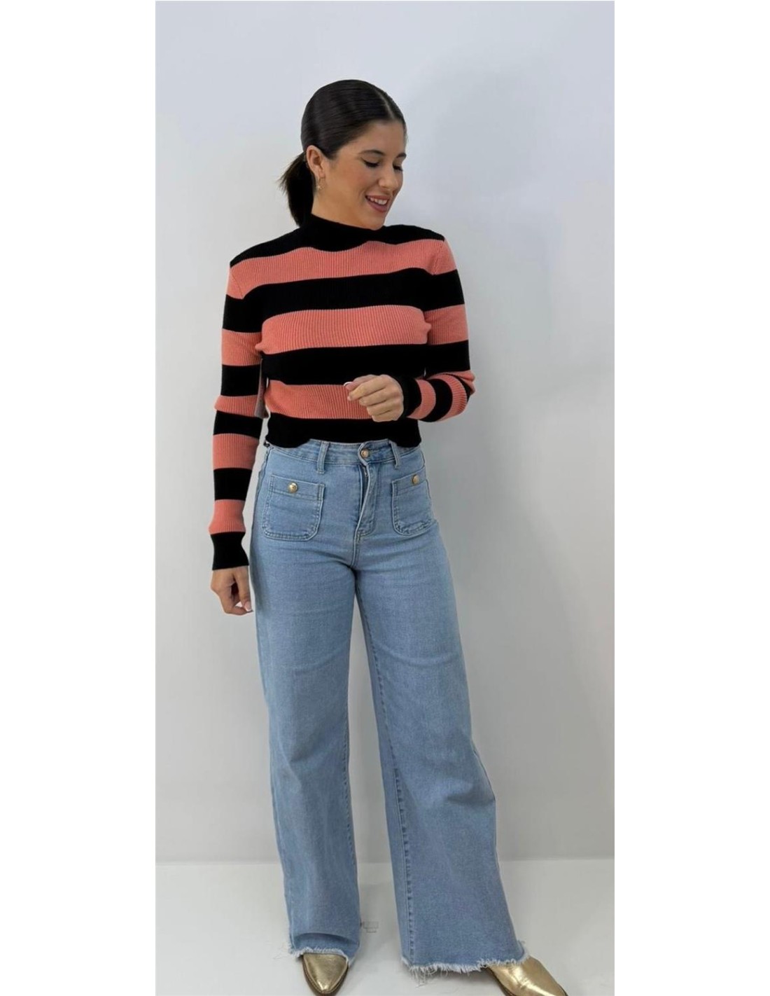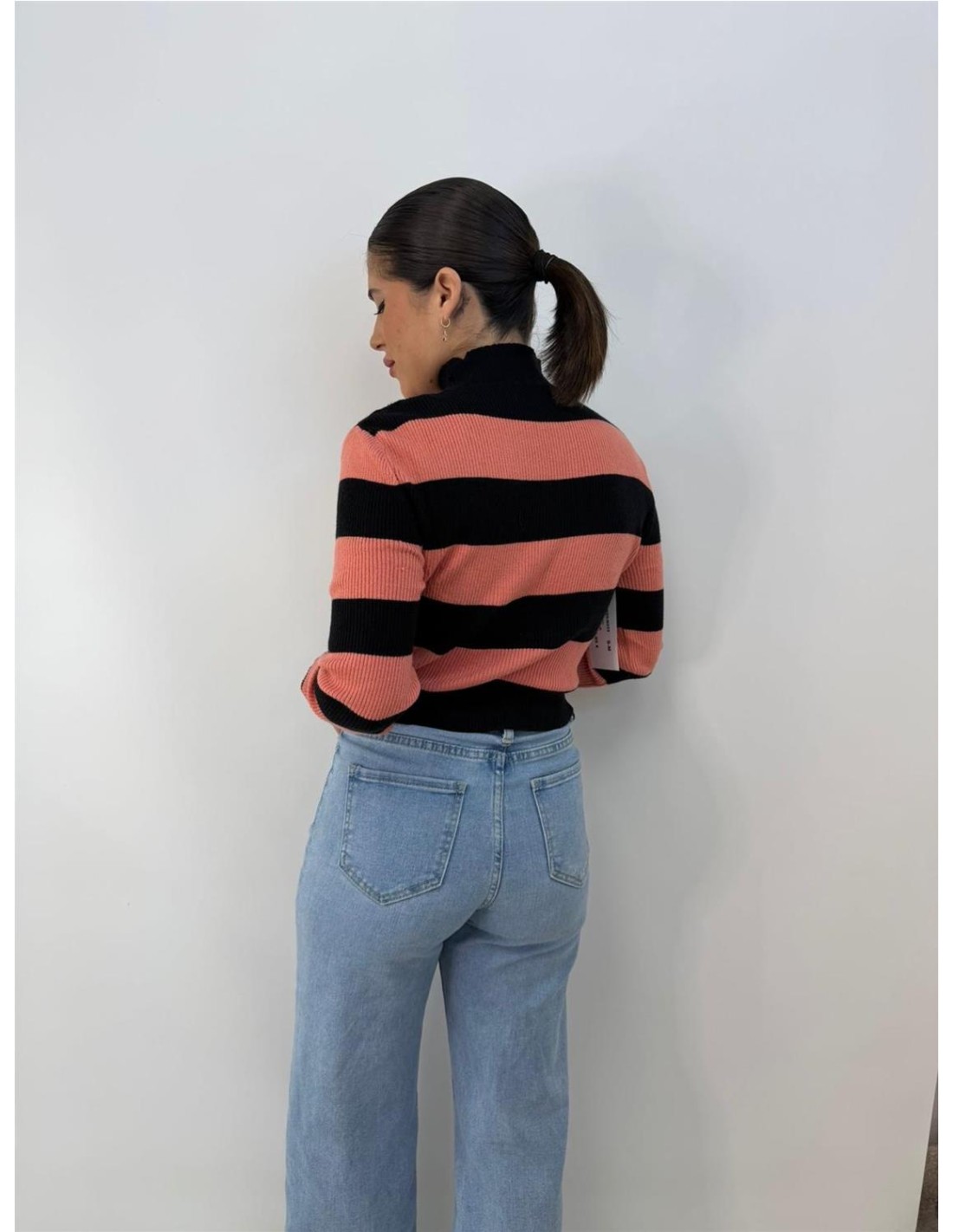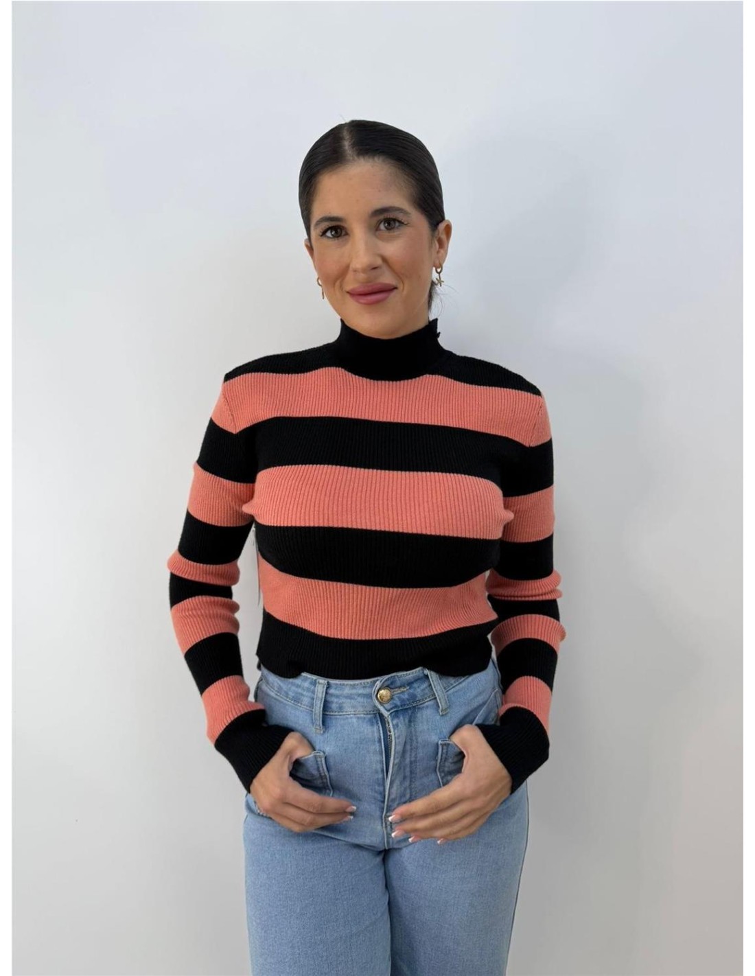 De canale, mangas largas, con rayas anchas. Su talla va desde una 34 hasta una 40 aproximadamente.