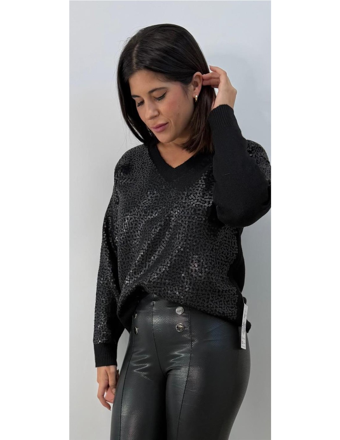 Jersey de punto de lana escote de pico con la parte delantera de lentejuelas. Talla unica 34 a 42 aprox