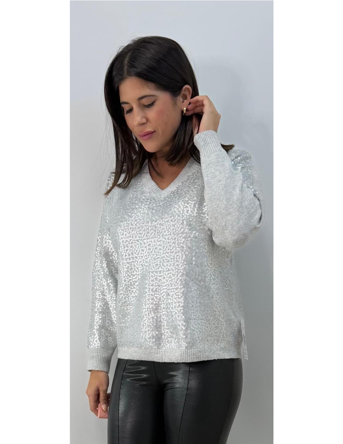 Jersey de punto de lana escote de pico con la parte delantera de lentejuelas. Talla unica 34 a 42 aprox