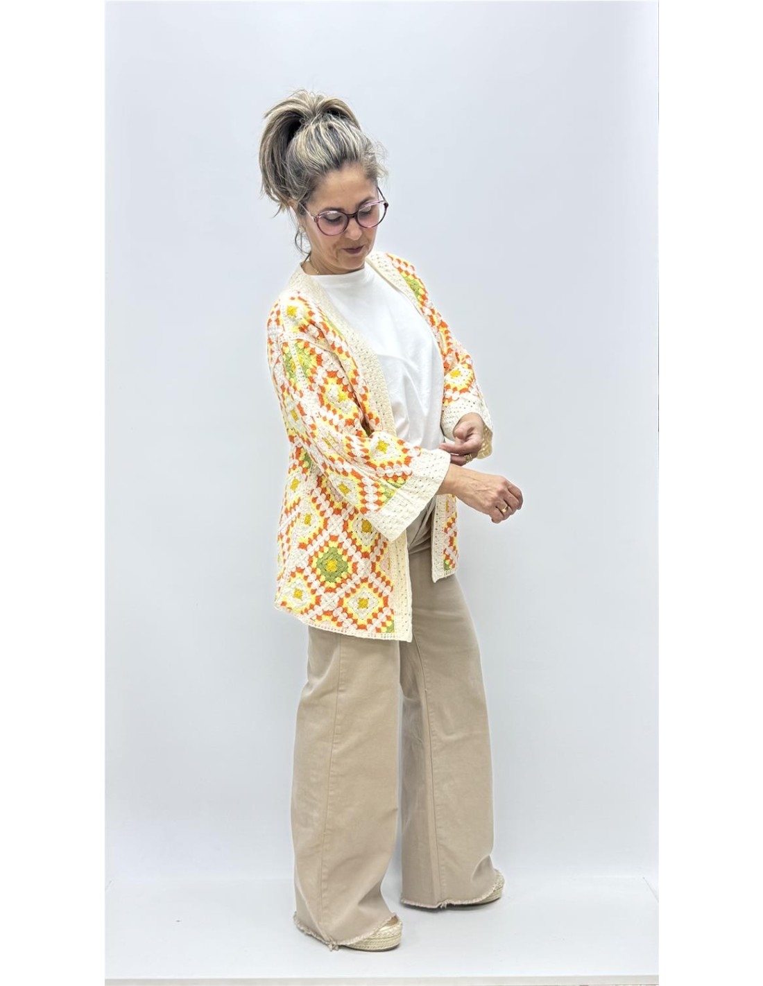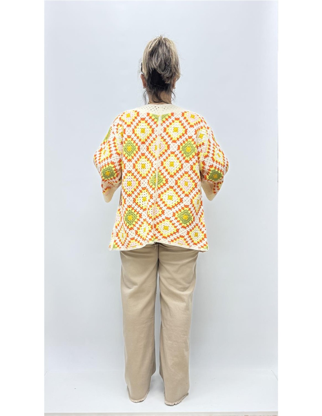 Kimono de croche multicolor, es de talla unica dando aprox desde la 36 hasta la 42.