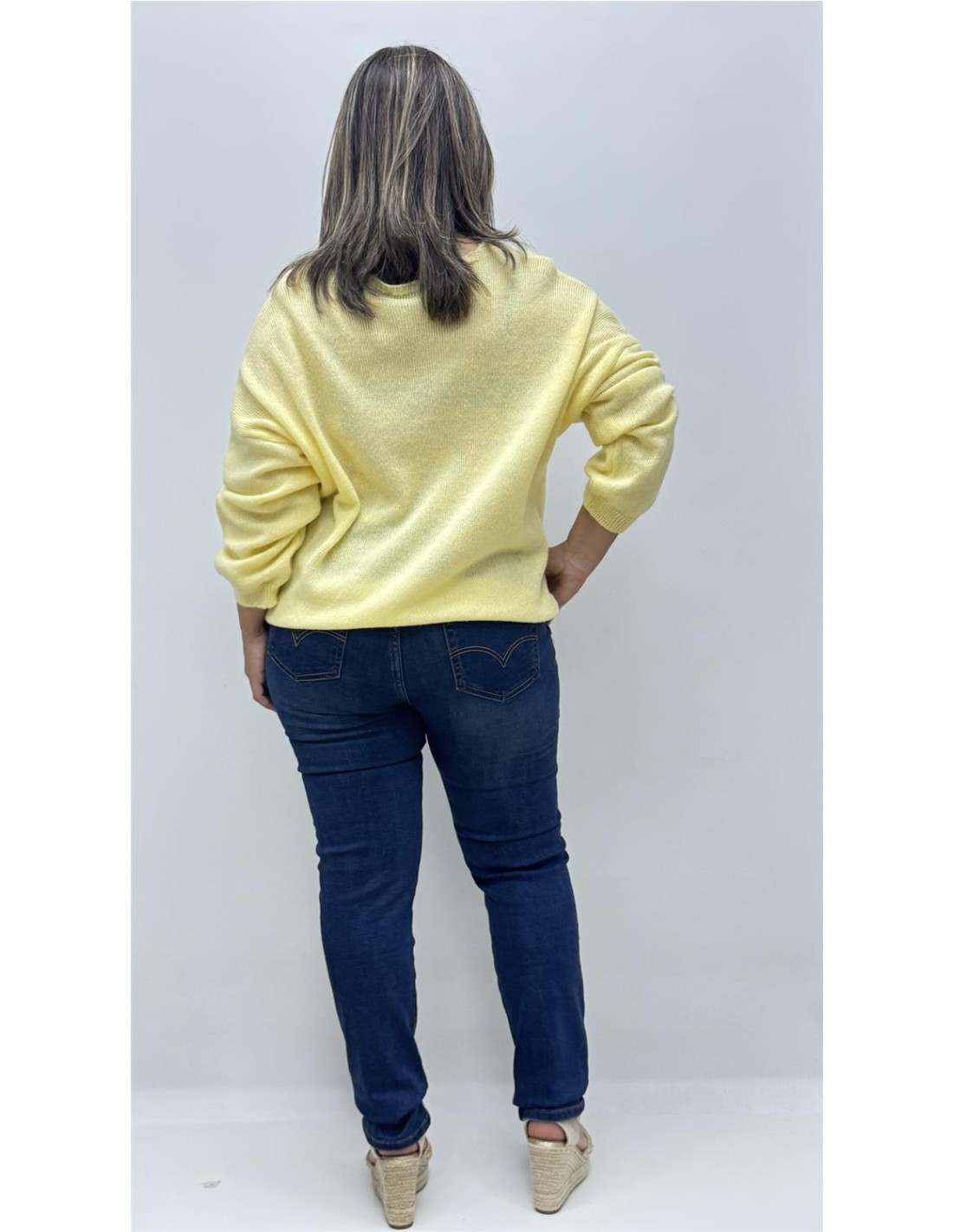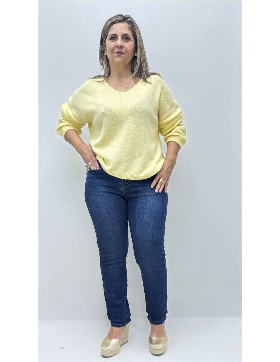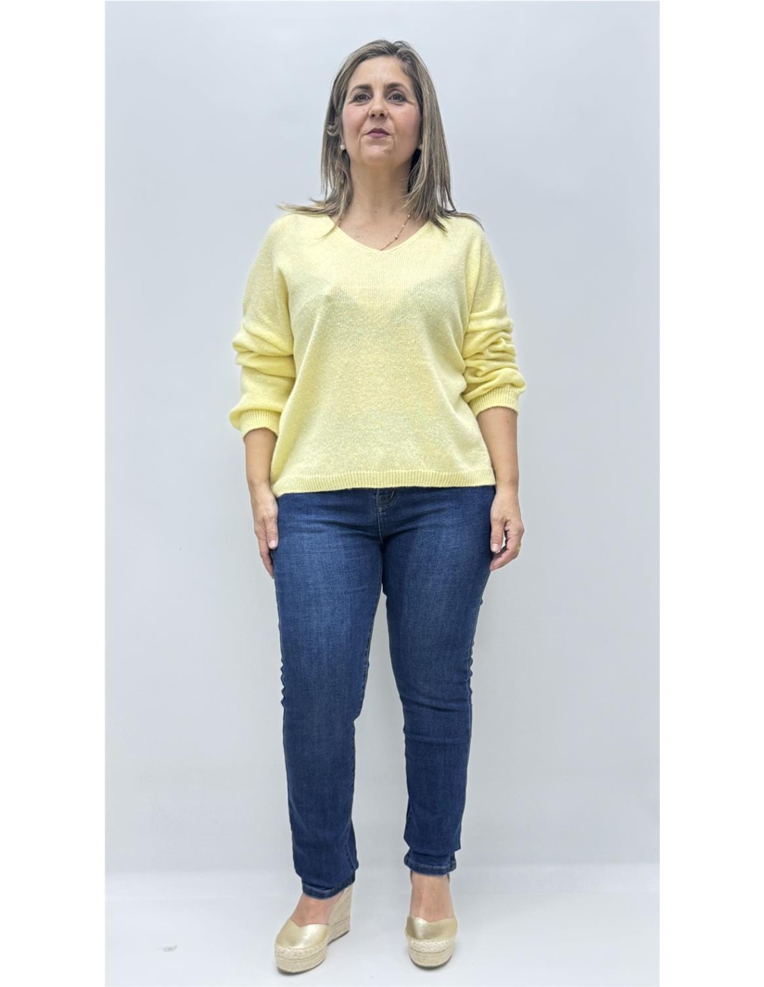 Jersey punto de cuello v, es de talla unica dando apox desde la 36 hasta la 44.