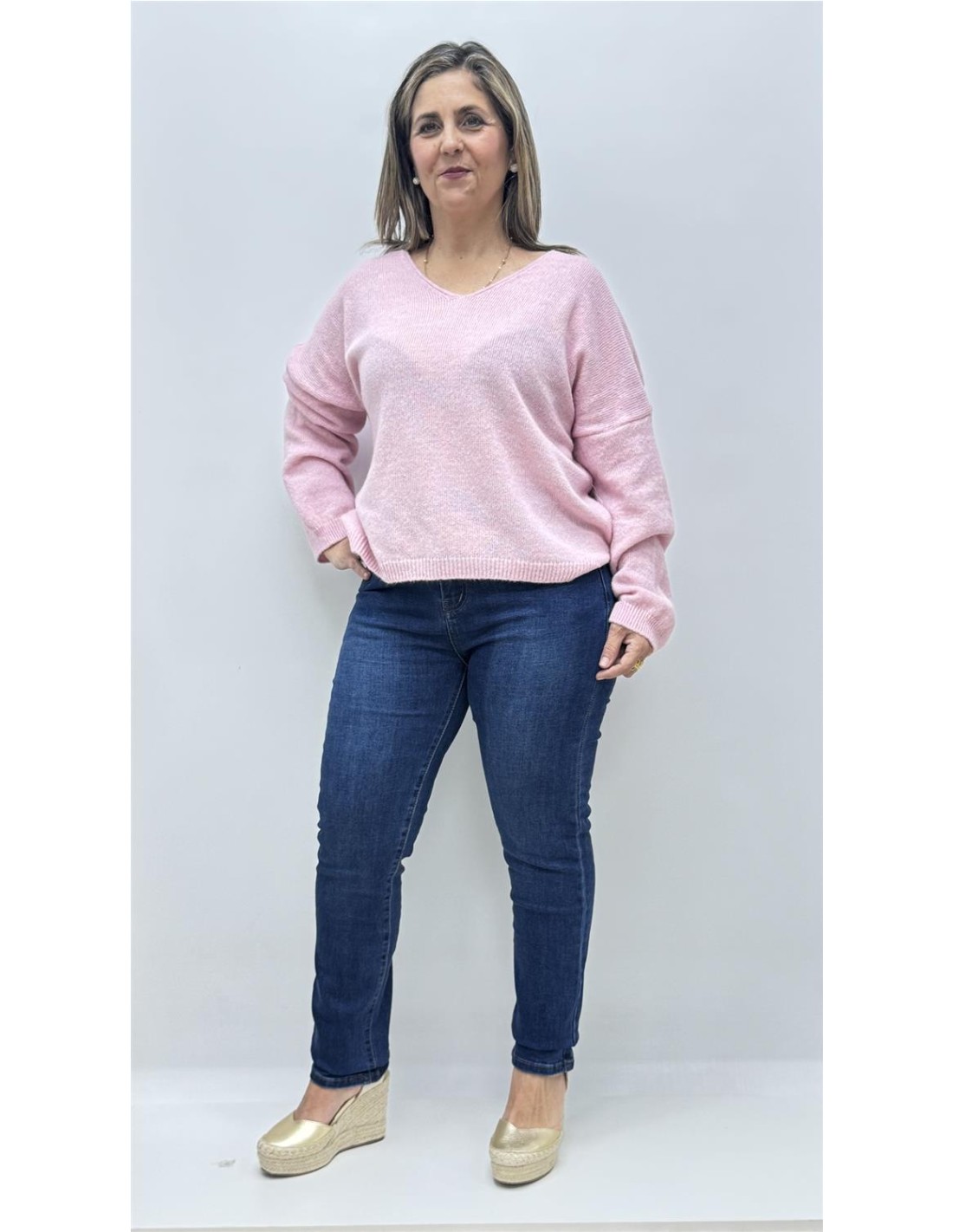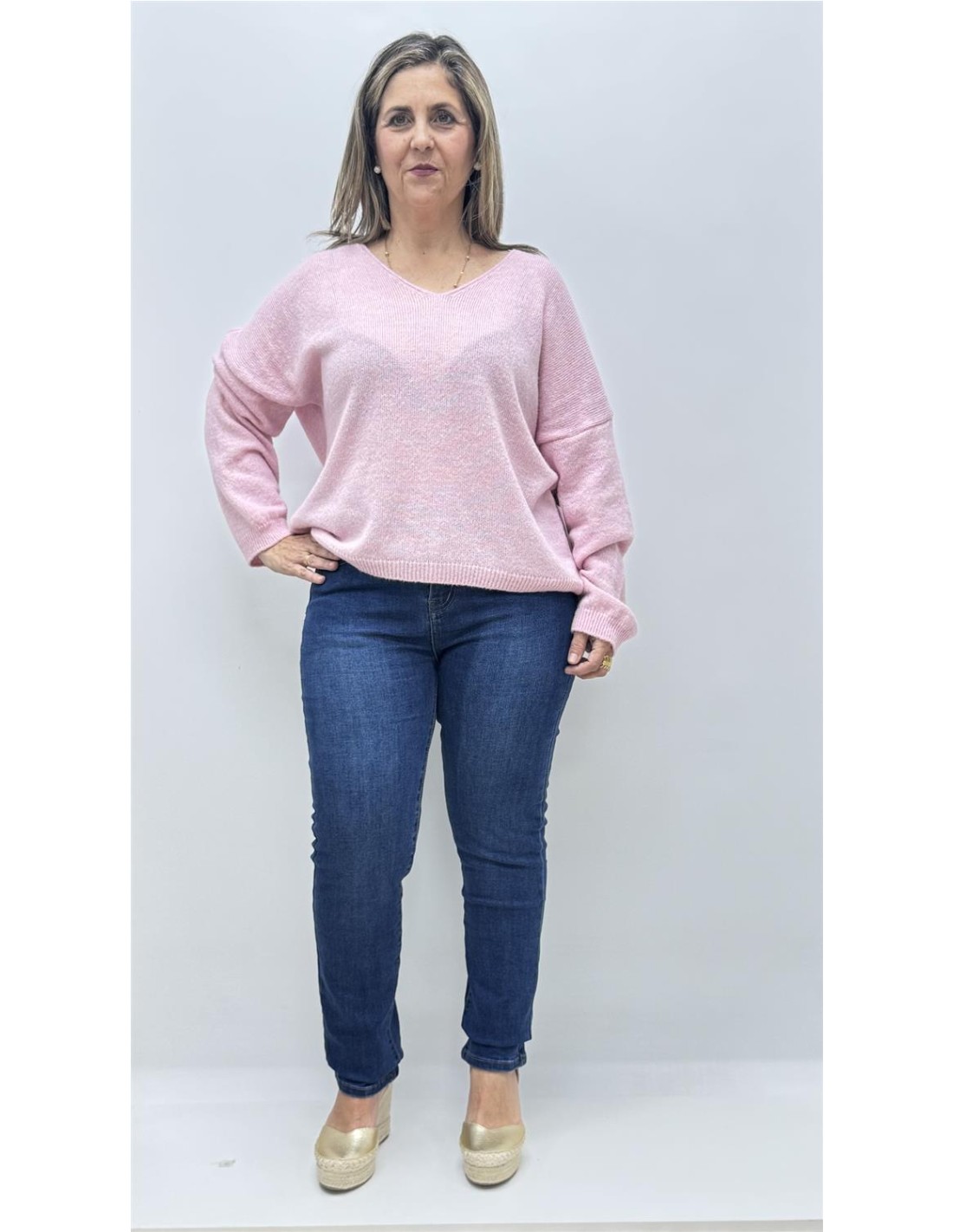Jersey punto de cuello v, es de talla unica dando apox desde la 36 hasta la 44.