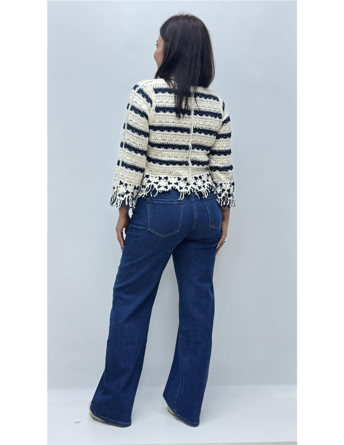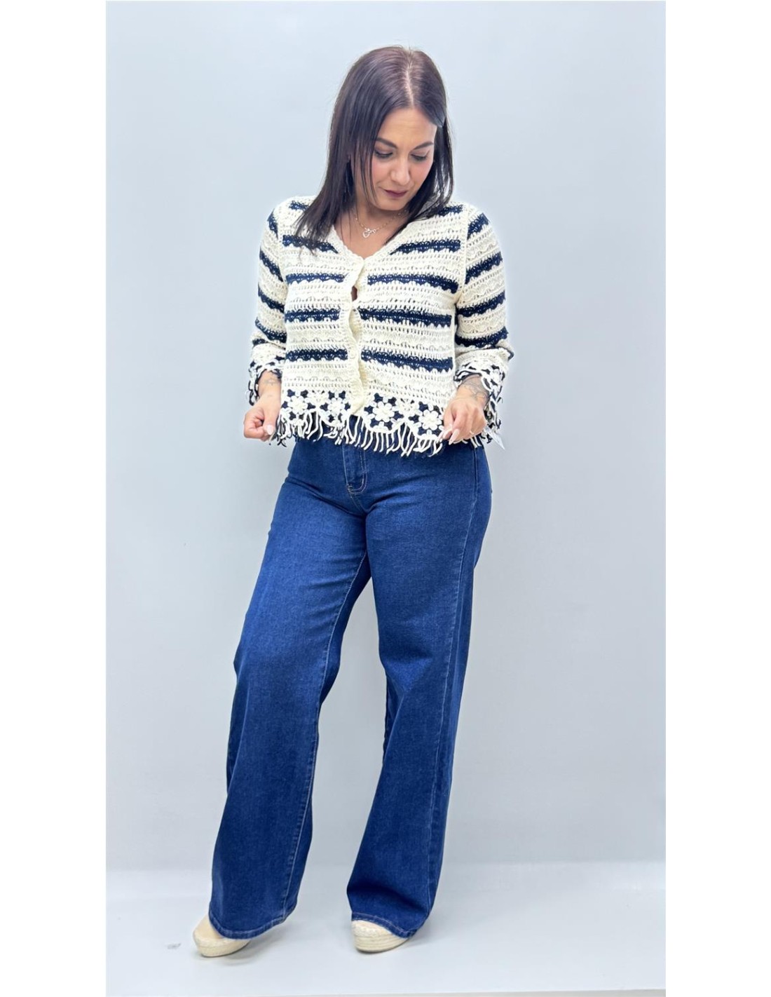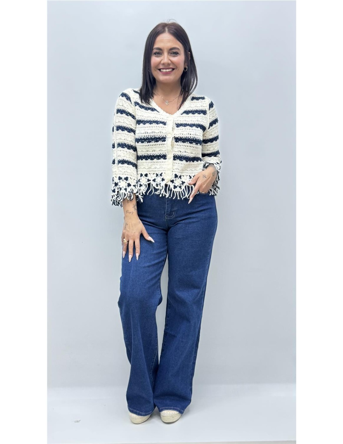 Rebeca de hilo bicolor con detalle de flecos, es de talla unica y da aprox desde la 36 hasta la 40.