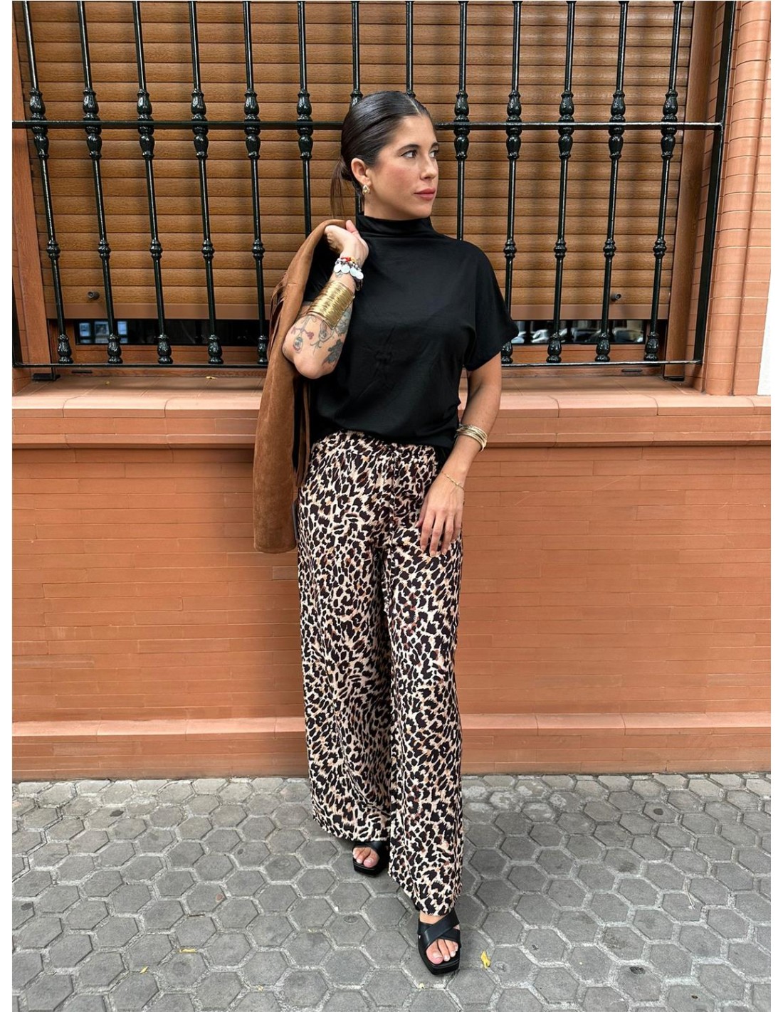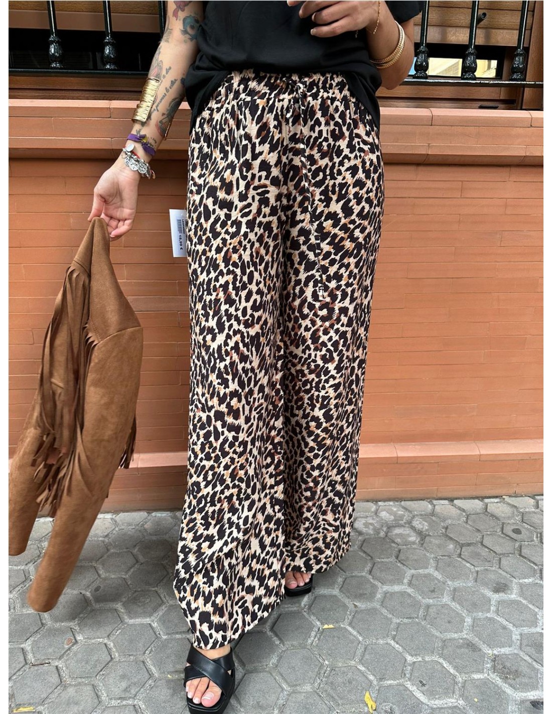 Cinturilla elástica, estampado, pata ancha. Su talla va desde una 36 hasta una 44 aproximadamente.