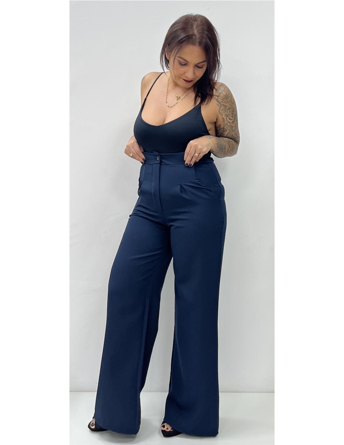 Pantalón recto con pinzas. Su talla puede dar desde una 34 hasta una 38. Combinado con el body HERMILA y la chaqueta BOTON