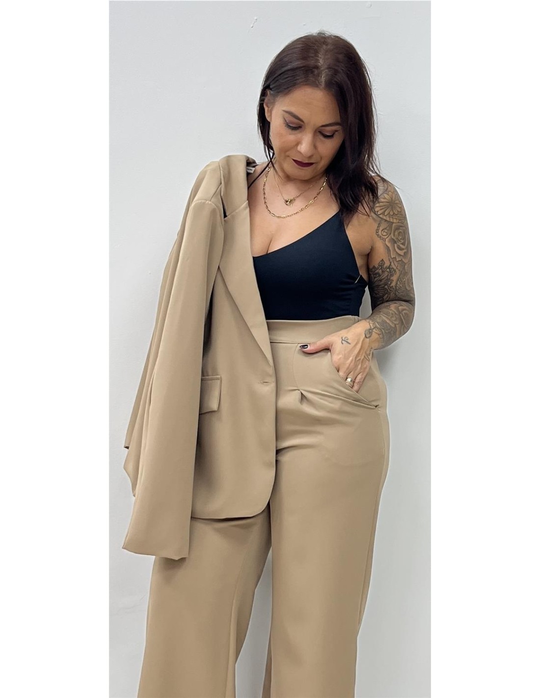 Pantalón recto con pinzas. Su talla puede dar desde una 34 hasta una 38. Combinado con el body HERMILA y la chaqueta BOTON