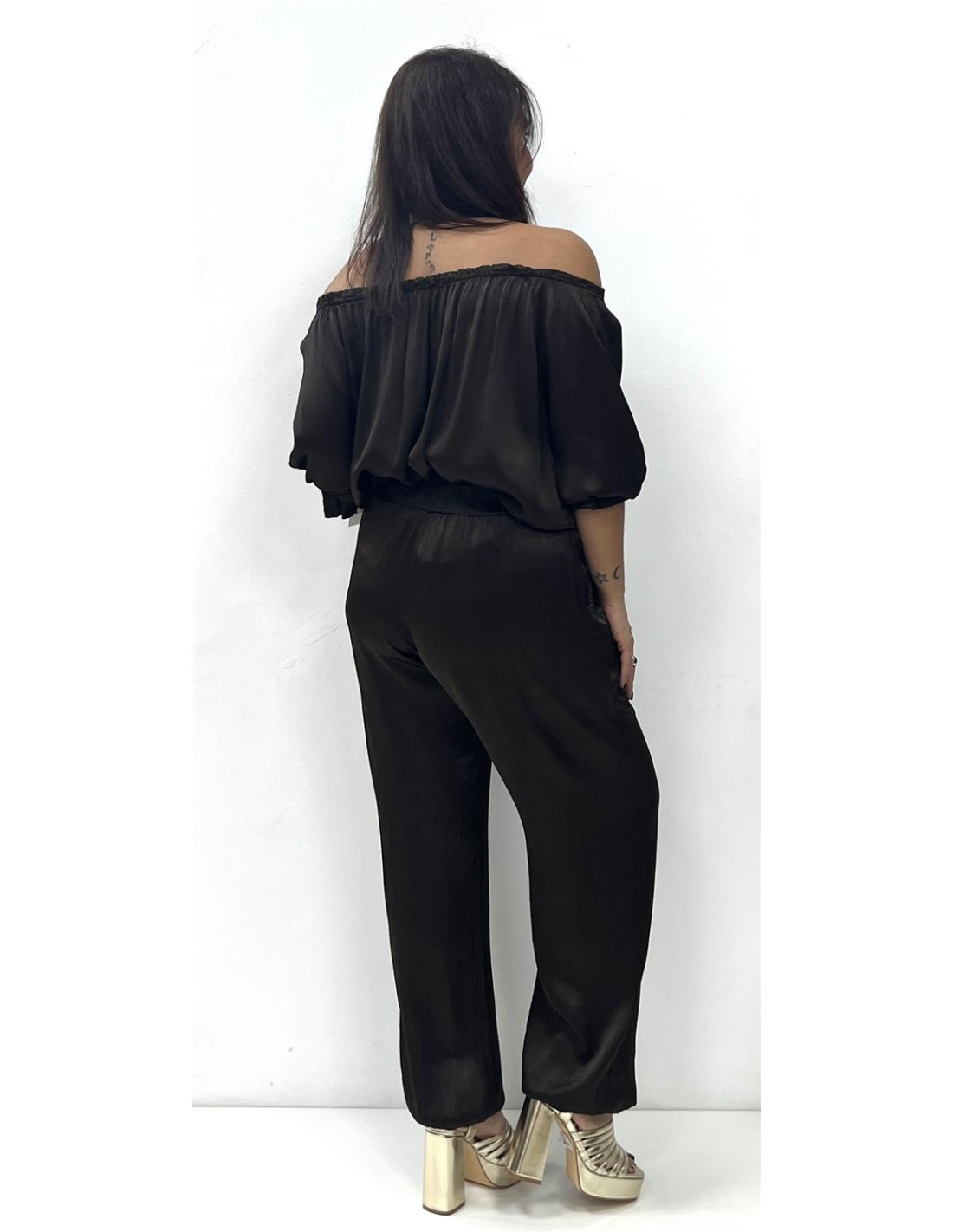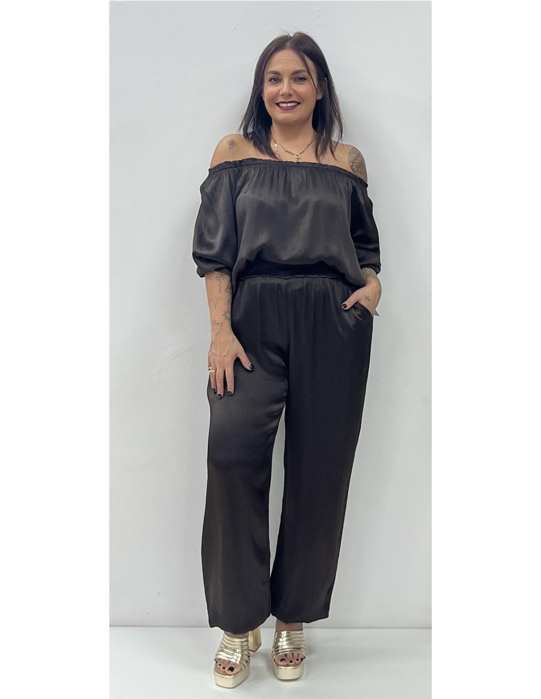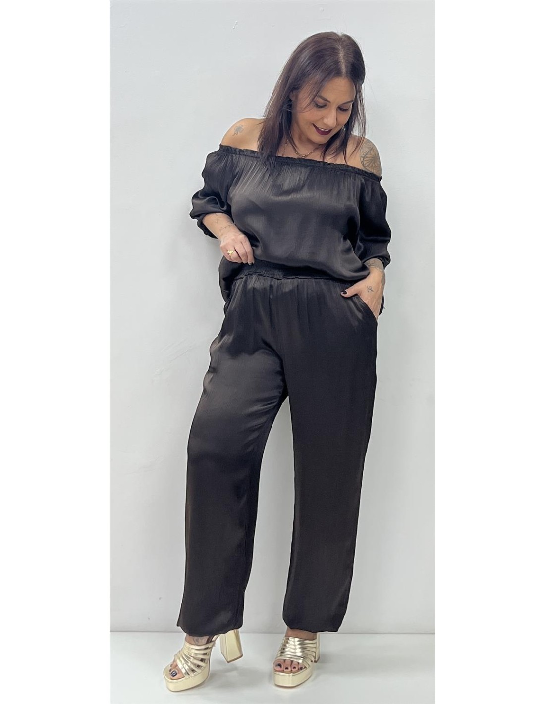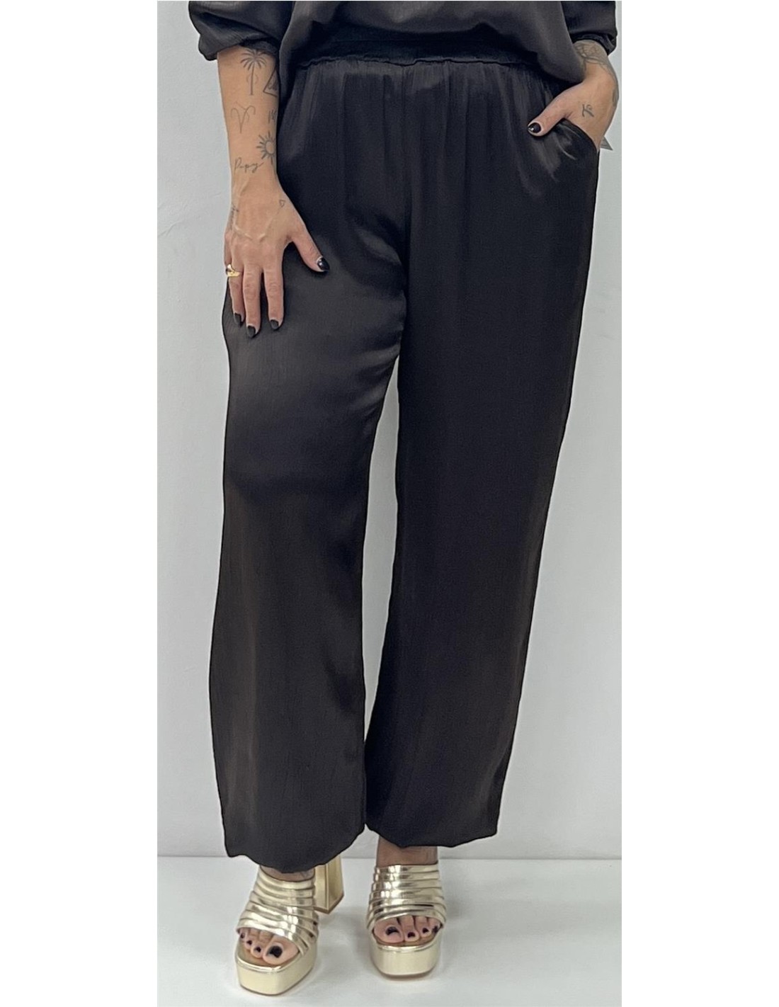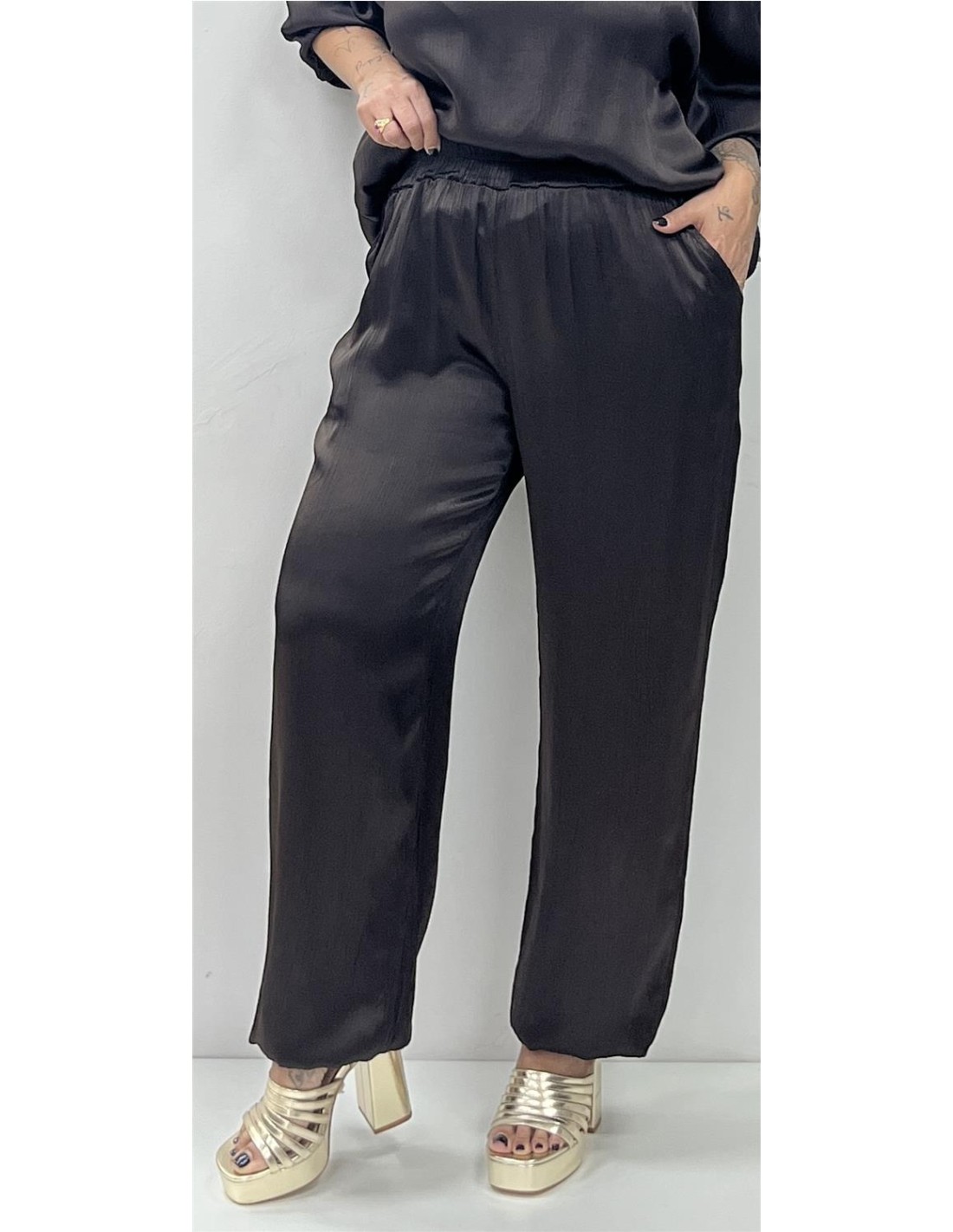 Pantalón satinado bombacho con elástico en el bajo. Su talla puede dar desde una 36 hasta una 42
