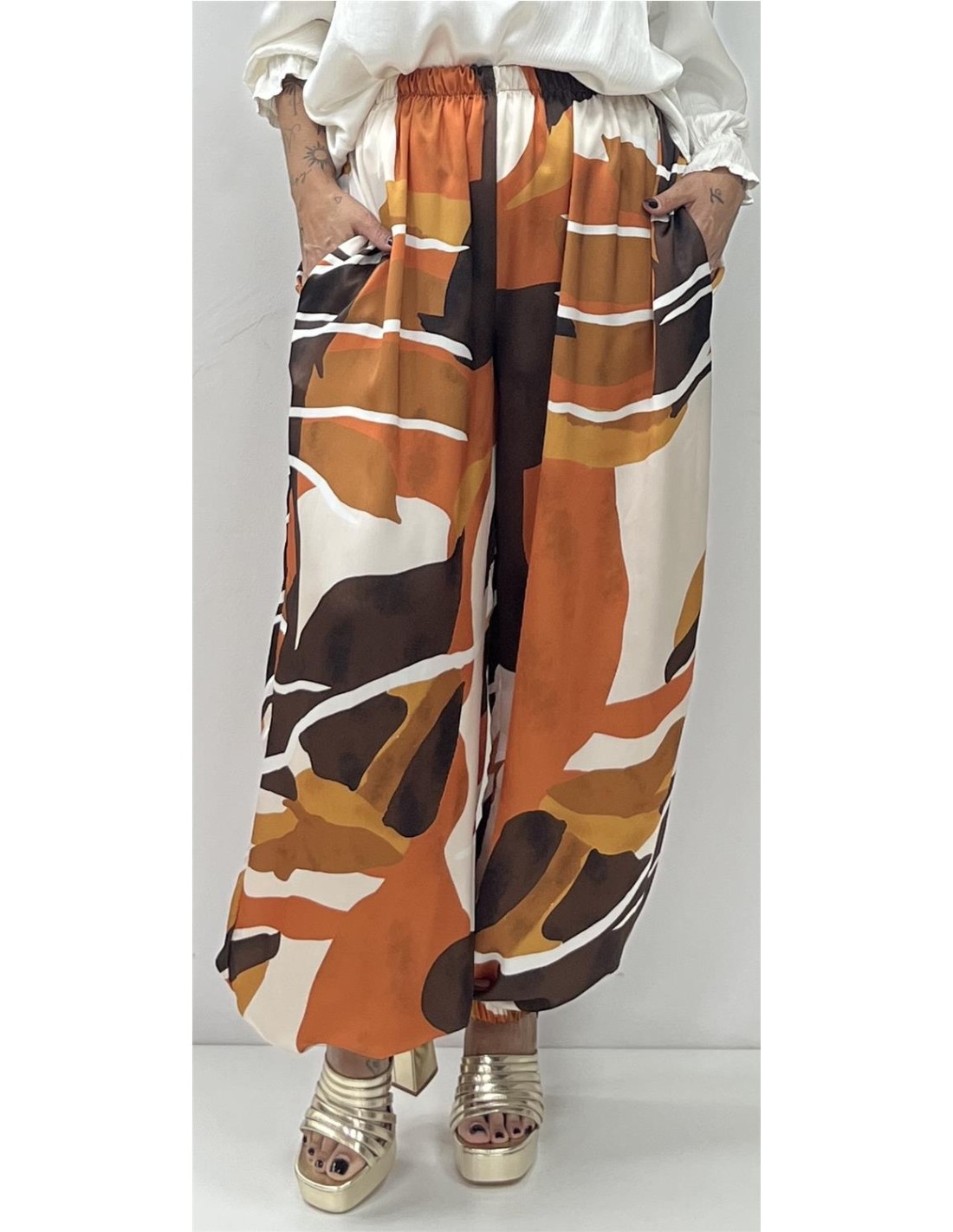 Pantalón satinado estampado. Su talla puede dar desde una 38 hasta una 46. Combinado con el top SATINADO GIRONA y el tacón TC213