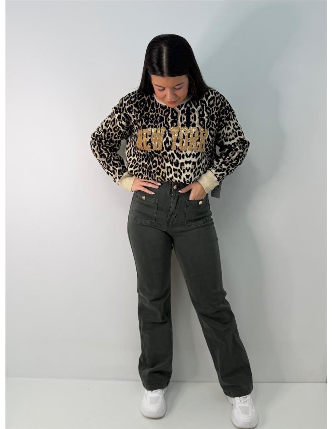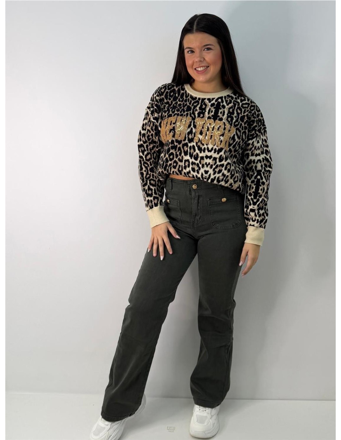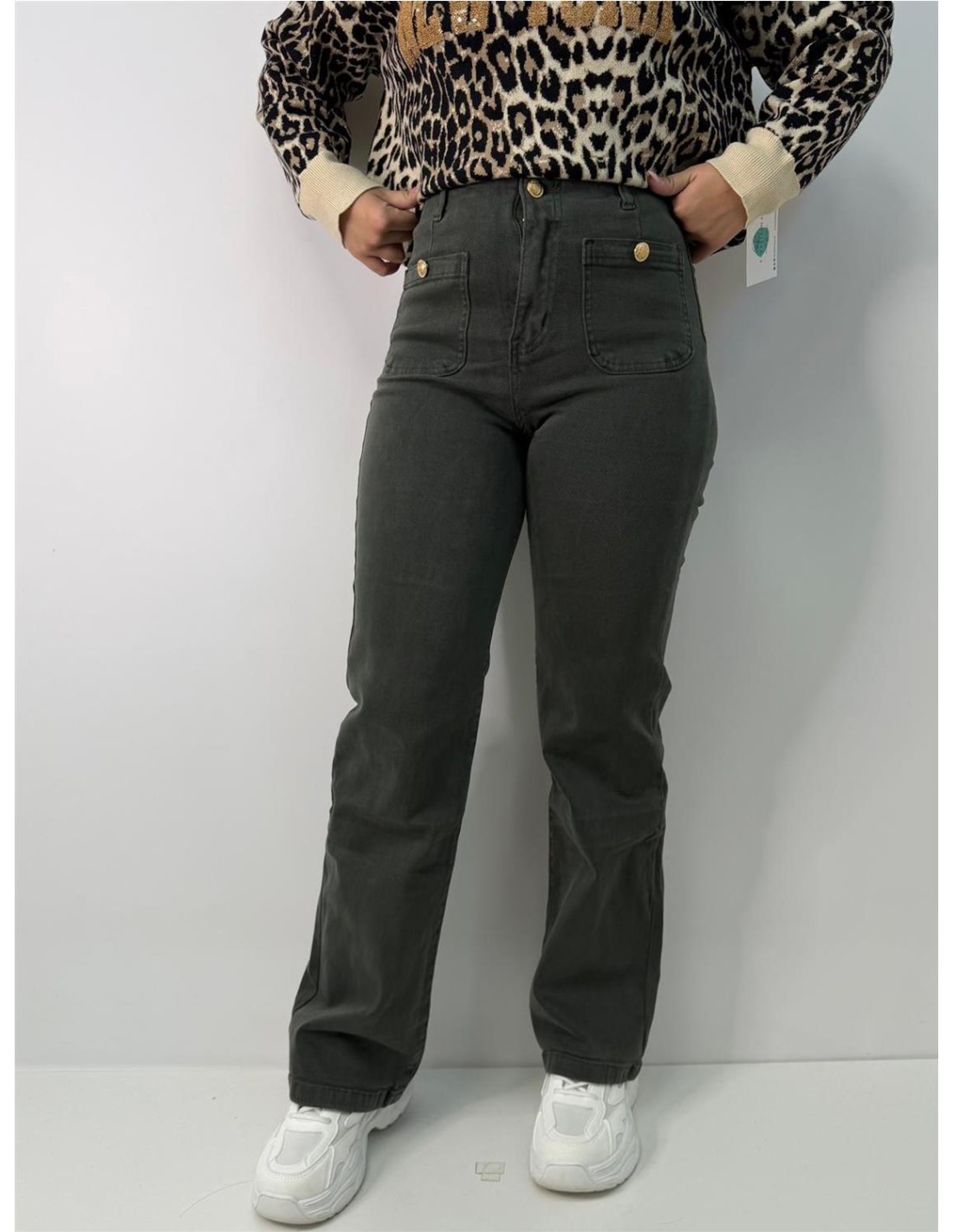 Pantalón vaquero de tiro alto con bolsillos con botones dorados. Sus tallas van desde la XS hasta la Xl y tallan bien.