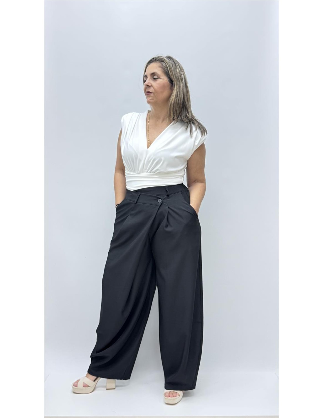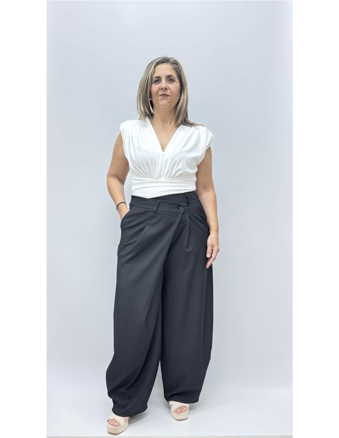 Pantalon cruzado de vestir efecto globo, es de talla unica dando aprox. desde la 36 hasta la 42.
