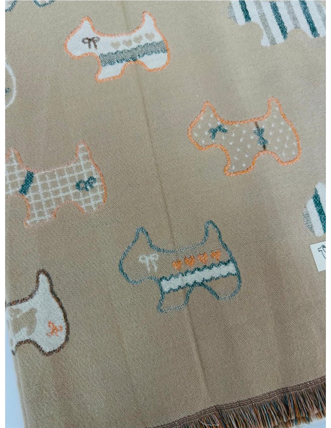 pañuelo con estampado de perros, su medida es de largo 188 cm y de ancho 69 cm.
