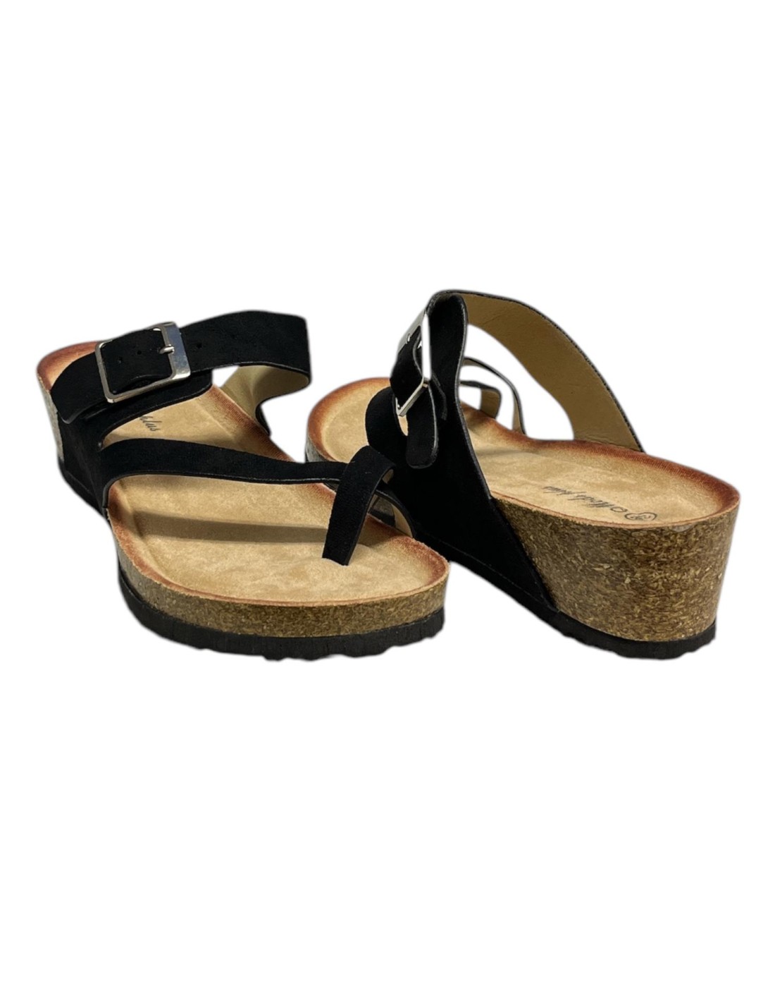 Sandalia de cuña de dedo con hebilla lateral. La cuña tiene una altura de 5cm.
