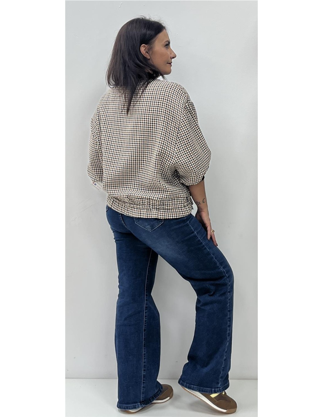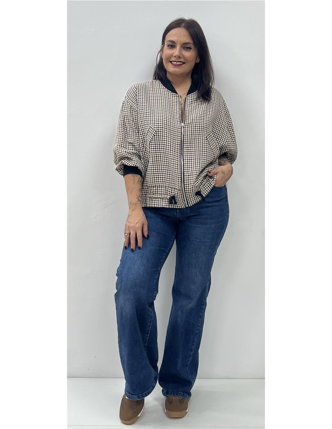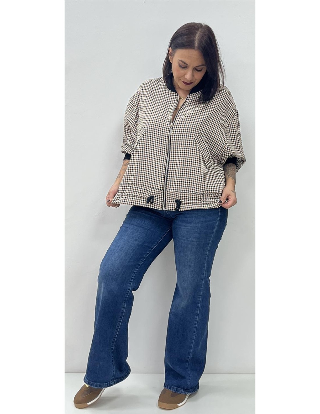 De cuadros, con cremallera, manga larga. Su talla va desde una 38 hasta una 44. Combinado con el PN07-625.
