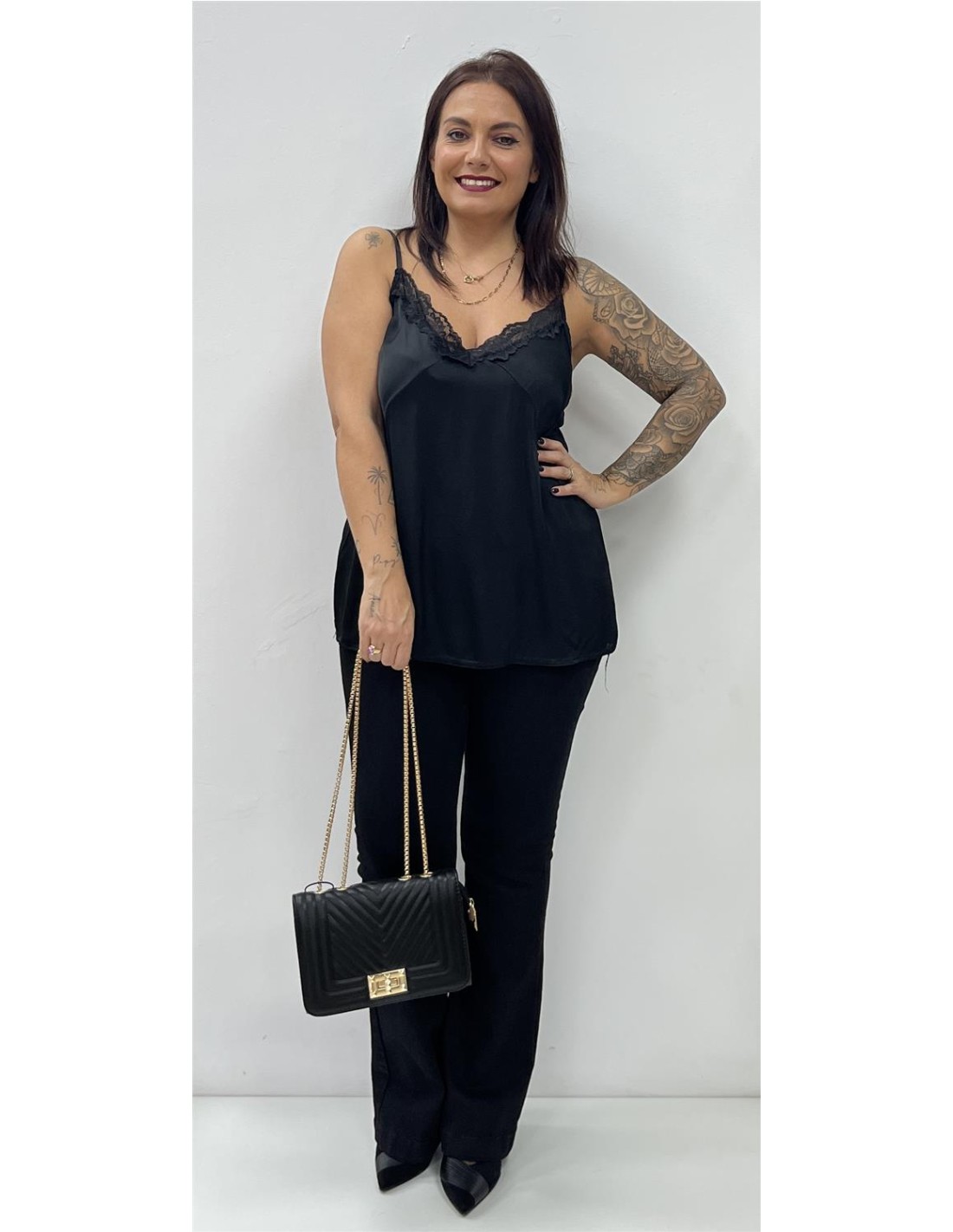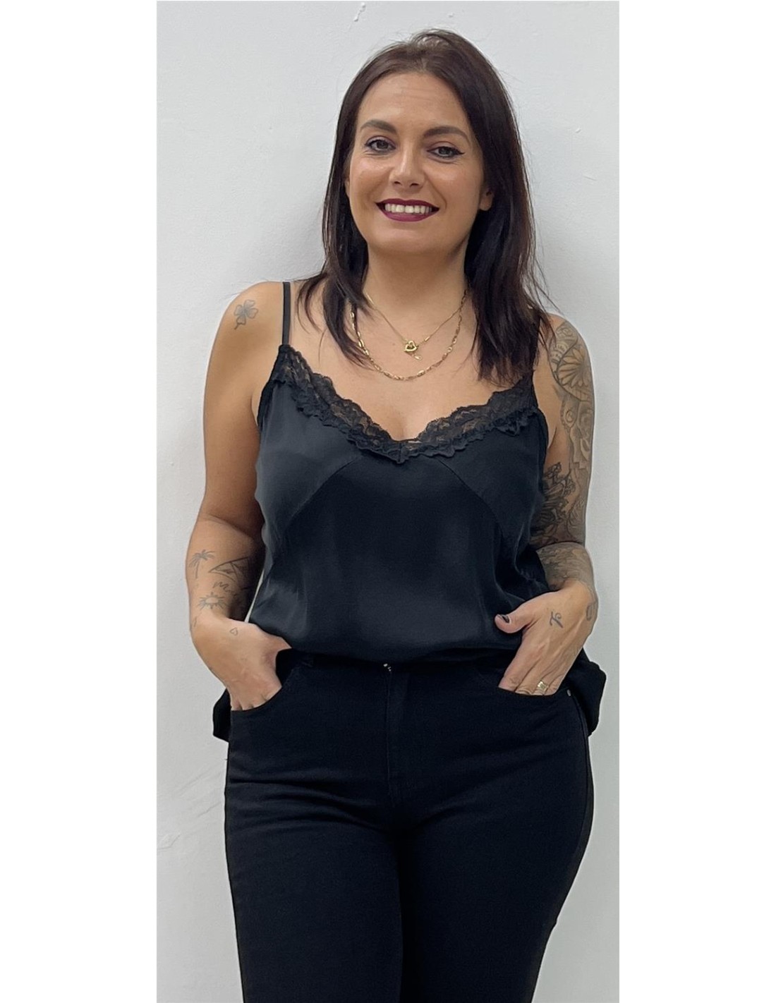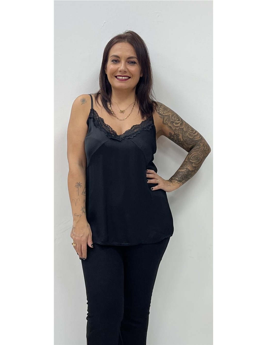 Lencero con encaje y tirantas. Su talla puede dar desde una 38 hasta una 44. Combinado con el pantalón ZAFIRA y el bolso BL45-1013
