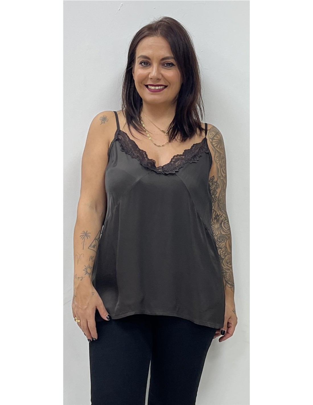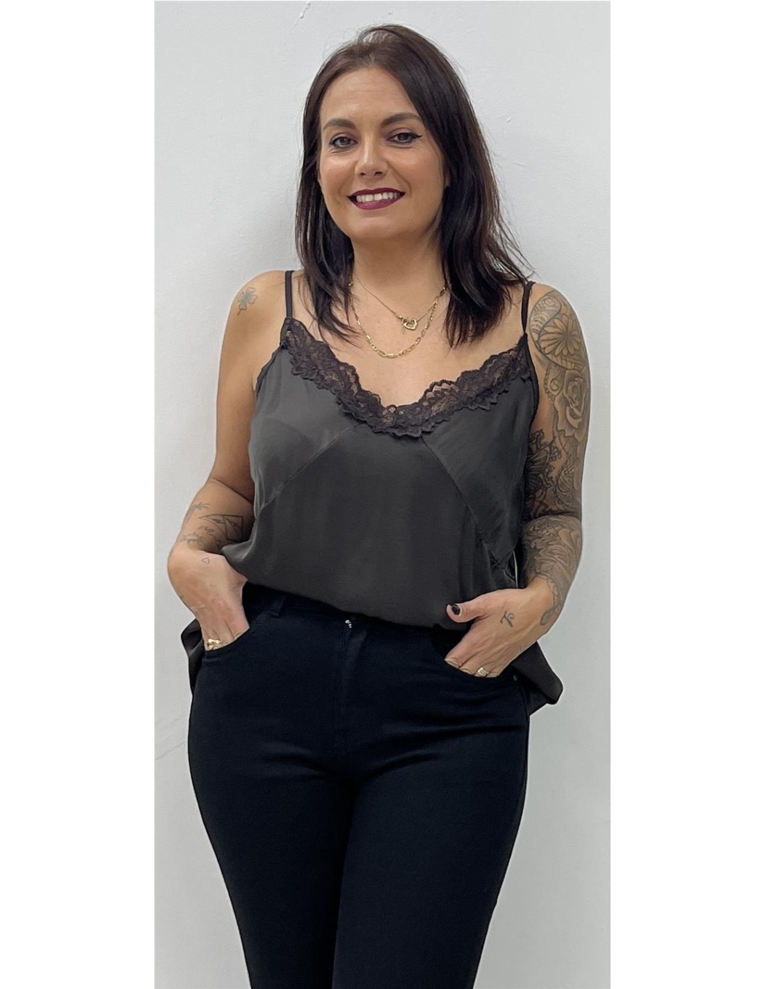 Lencero con encaje y tirantas. Su talla puede dar desde una 38 hasta una 44. Combinado con el pantalón ZAFIRA y el bolso BL45-1013