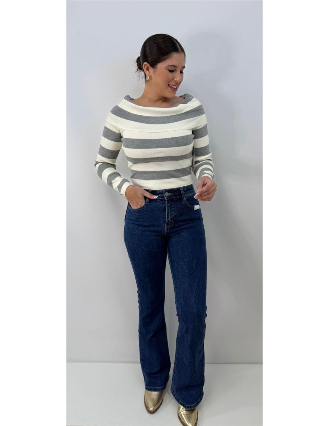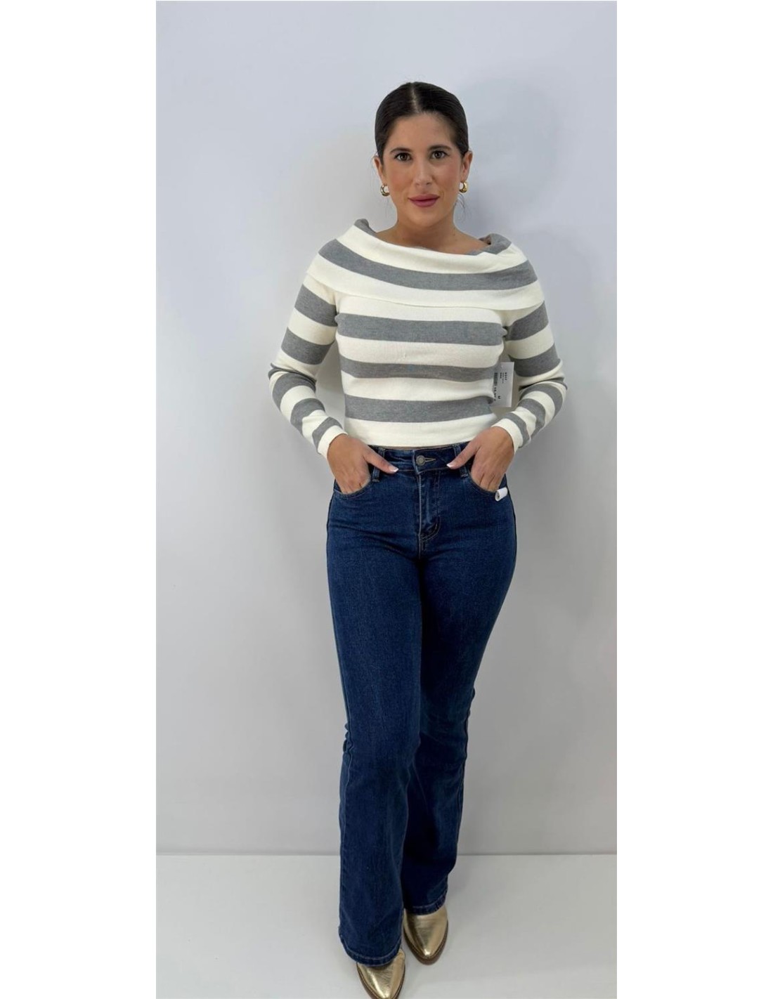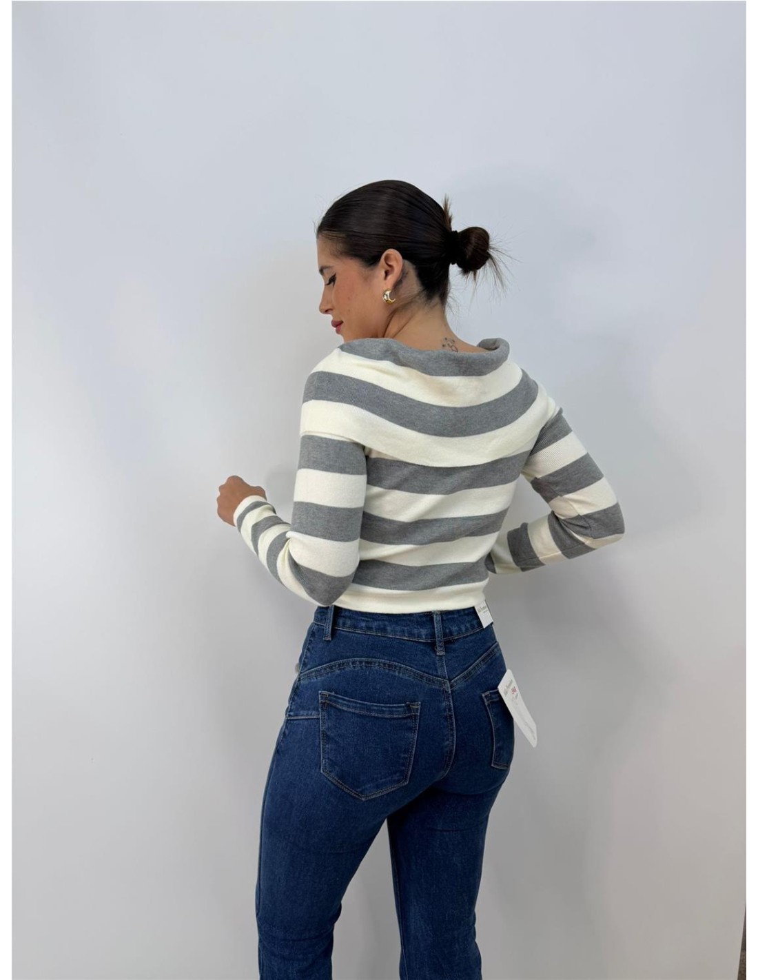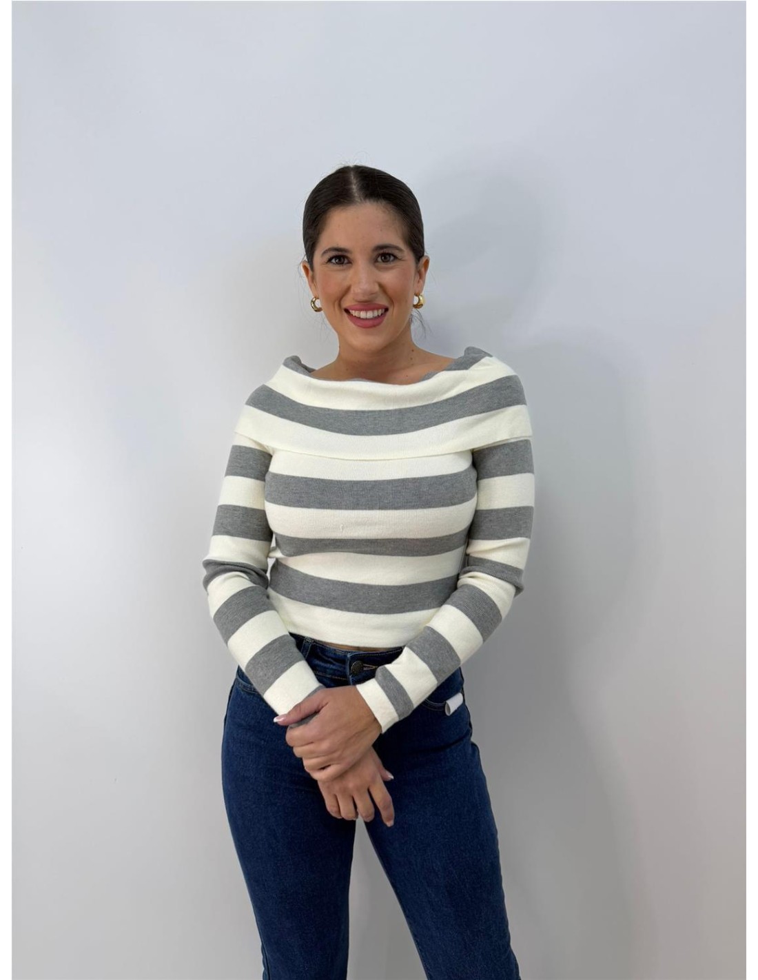 De punto, mangas larrgas, palabra de honor, con ryas anchas. Su talla va desde una 34 hasta una 42 aproximadamente.
