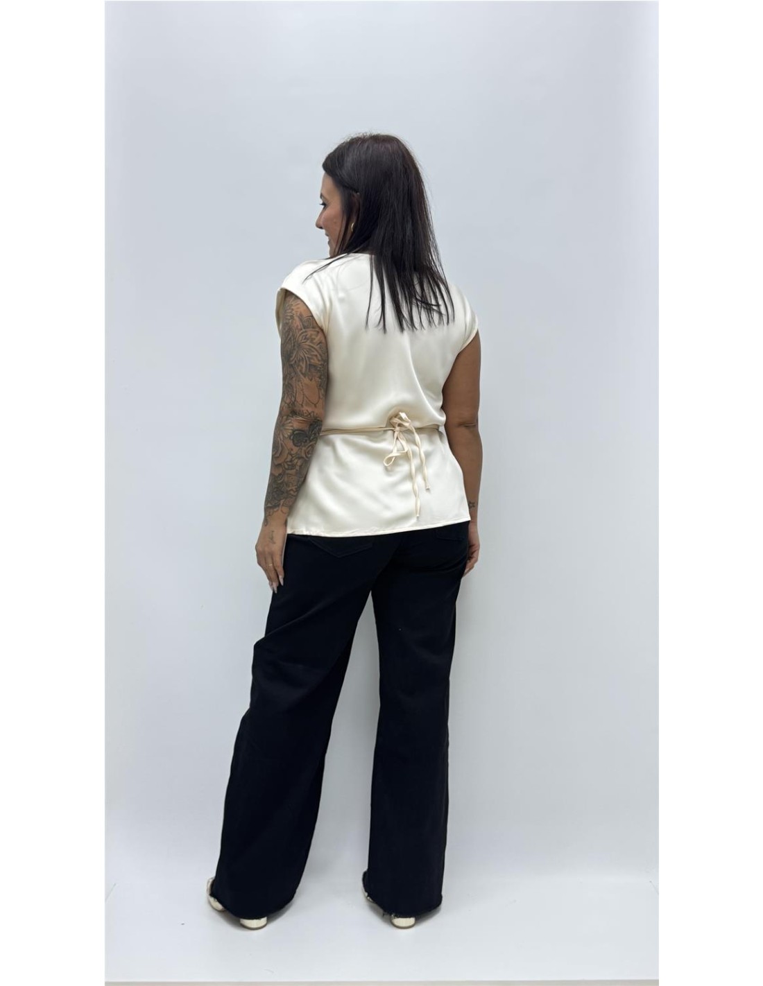 top satinado cuello barco con detalle de lazo, es de talla unica dando aprox desde la 36 hasta la 40.