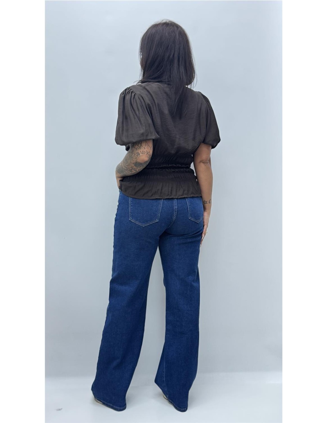 top con bajo fruncido y manga abullonada, es de talla unica dando aprox desde la 34 hasta la 40.