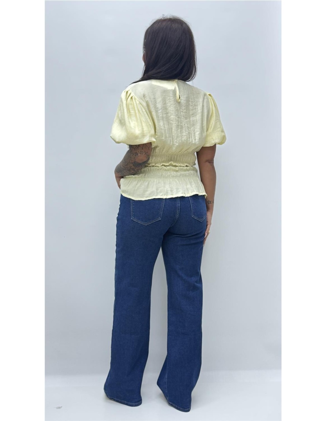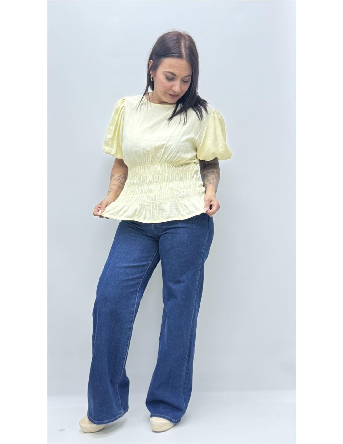 top con bajo fruncido y manga abullonada, es de talla unica dando aprox desde la 34 hasta la 40.