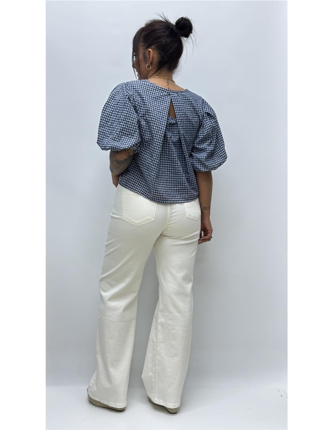 Top con manga abullonada y parte trasera abierta, es de talla unica dando aprox desde la 36 hasta la 40.