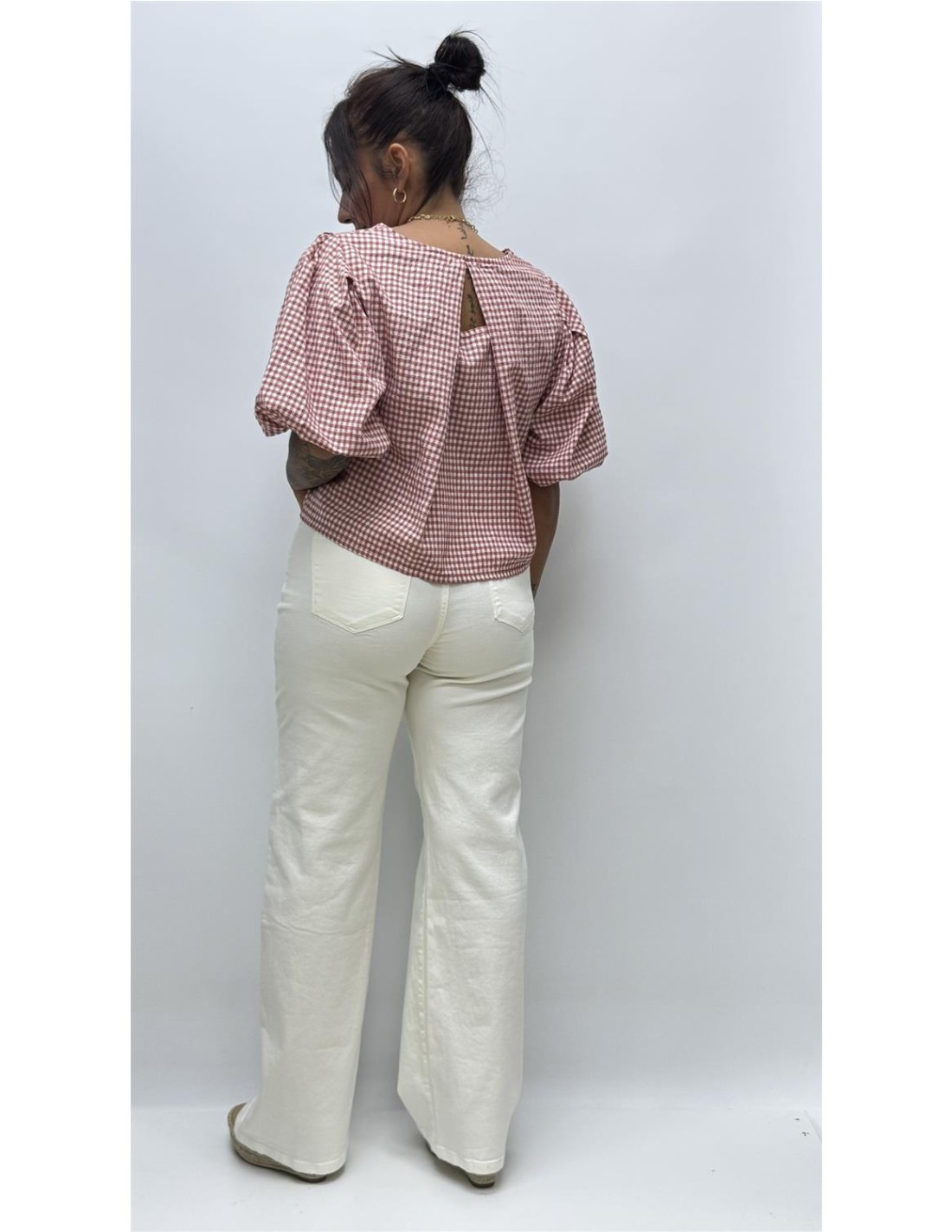 Top con manga abullonada y parte trasera abierta, es de talla unica dando aprox desde la 36 hasta la 40.