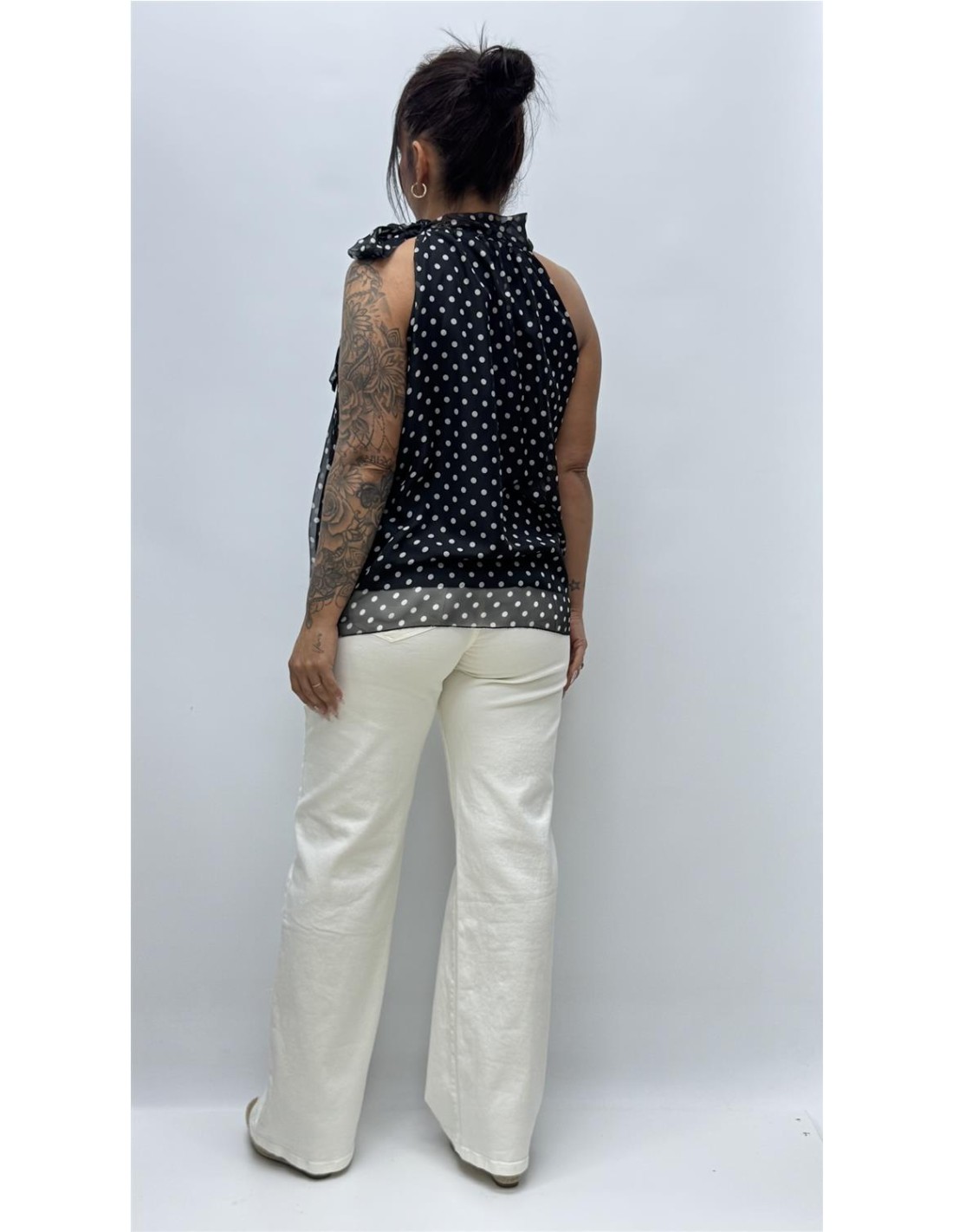 Top de gasa cuello halter con lazo lateral, es de talla unica dando aprox desde la 36 hasta la 44.