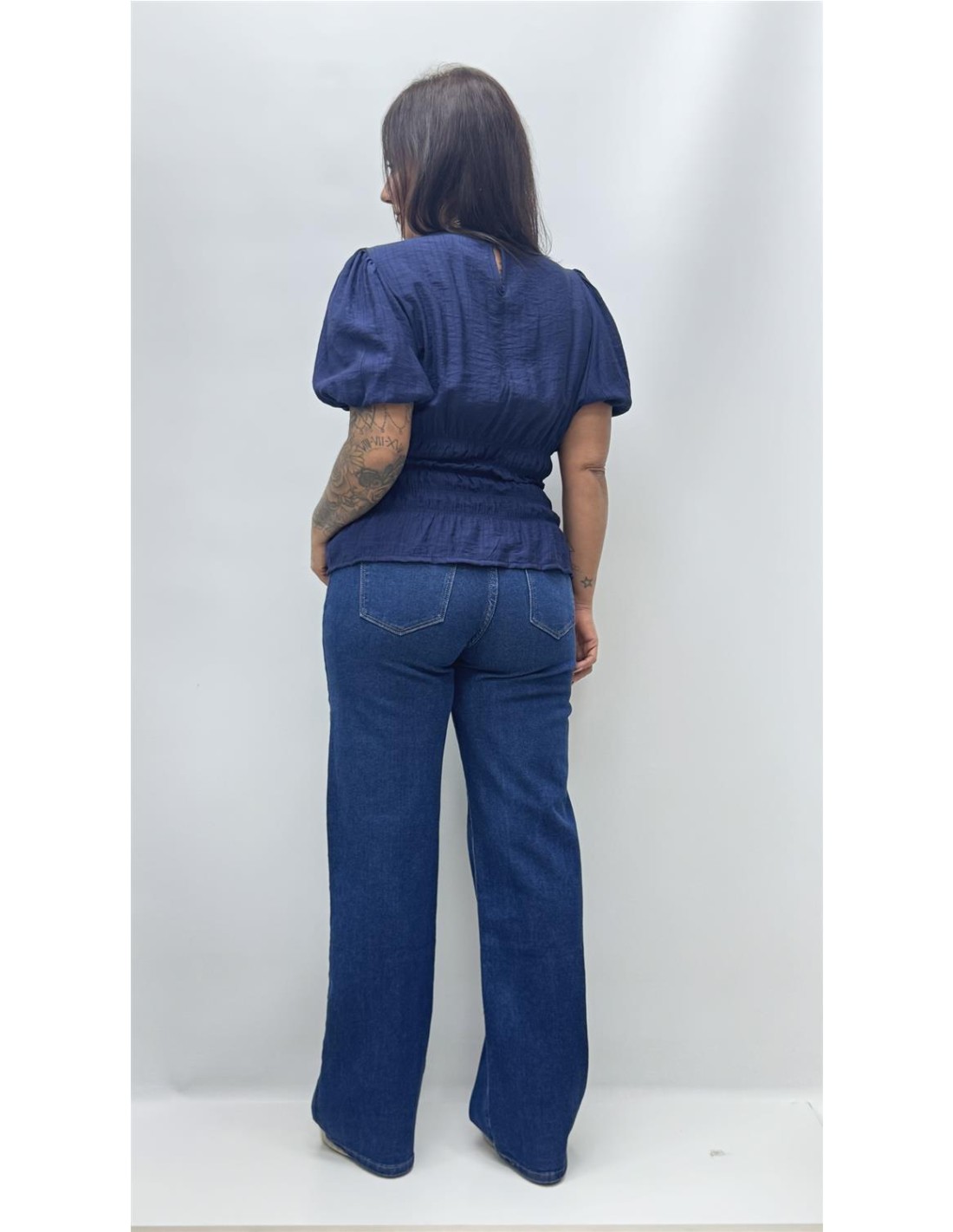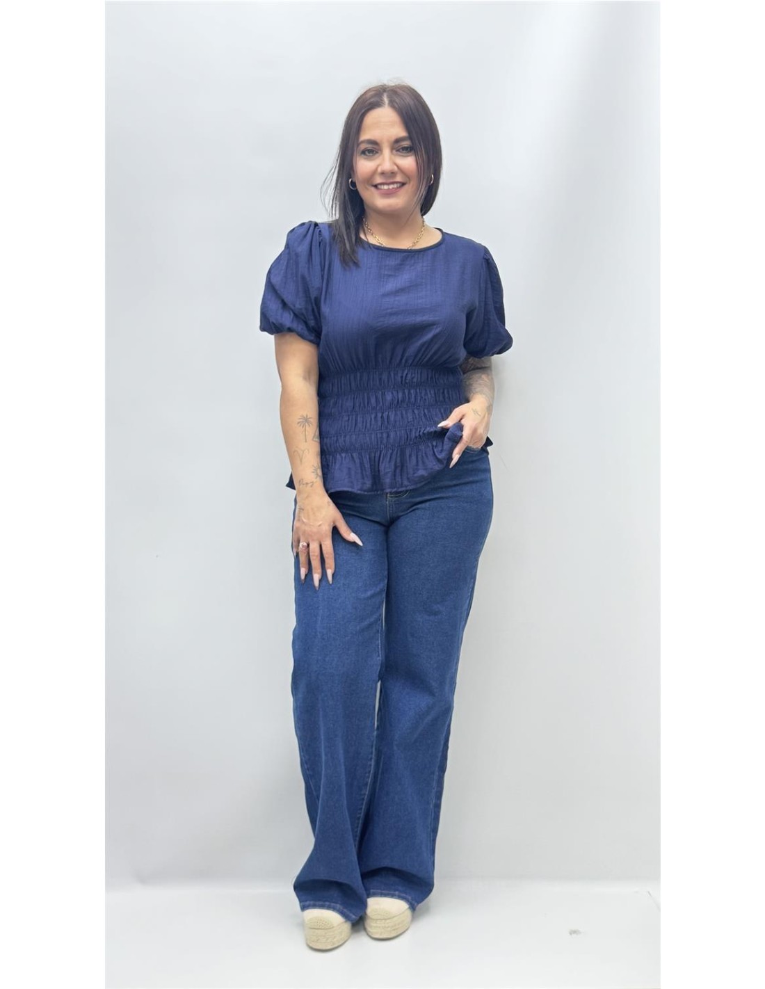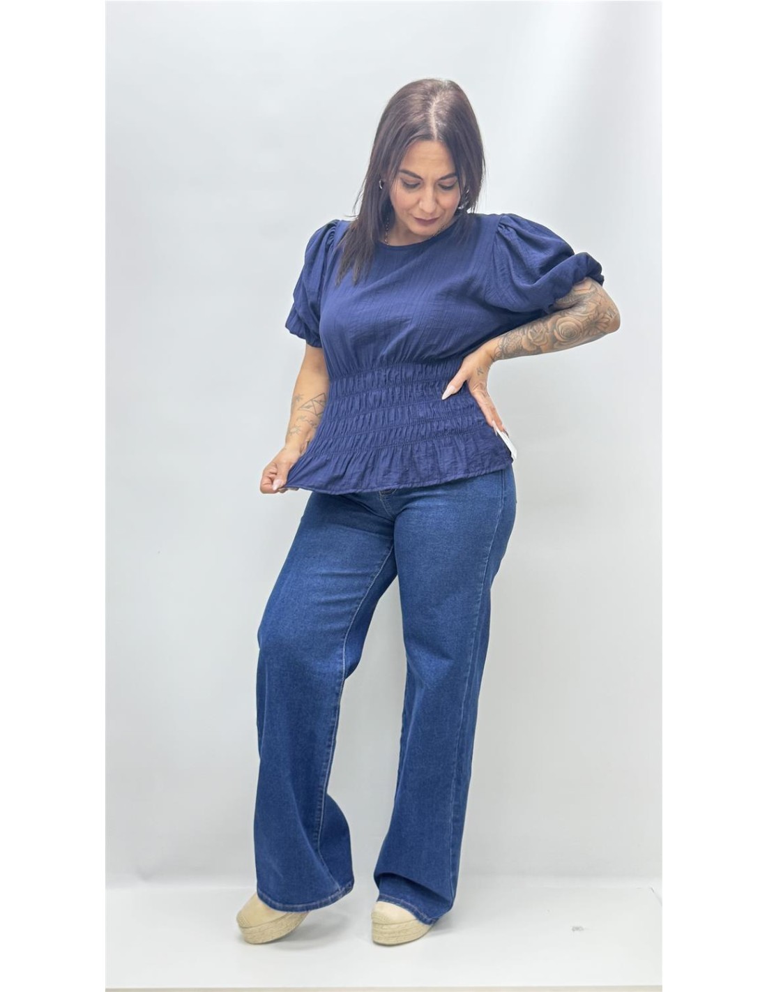 top con bajo fruncido y manga abullonada, es de talla unica dando aprox desde la 34 hasta la 40.