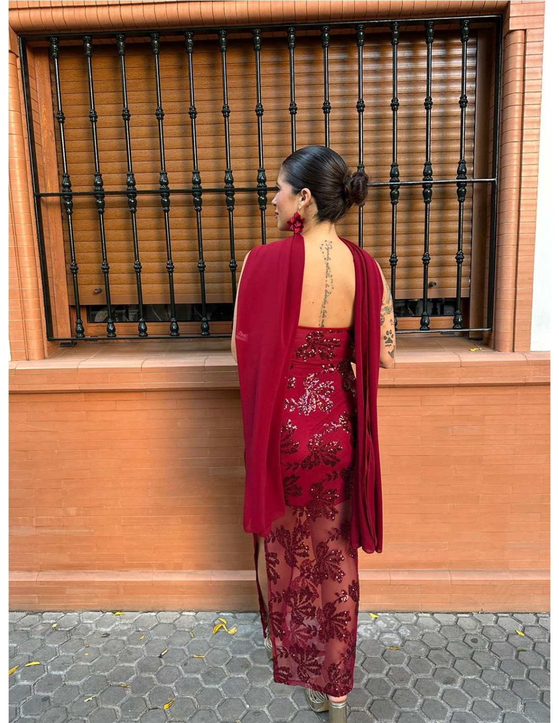 De tiranta fina, con lentejuelas, largo, con transparencias. Su talla va desde una 36 hasta una 42 aproximadamente.