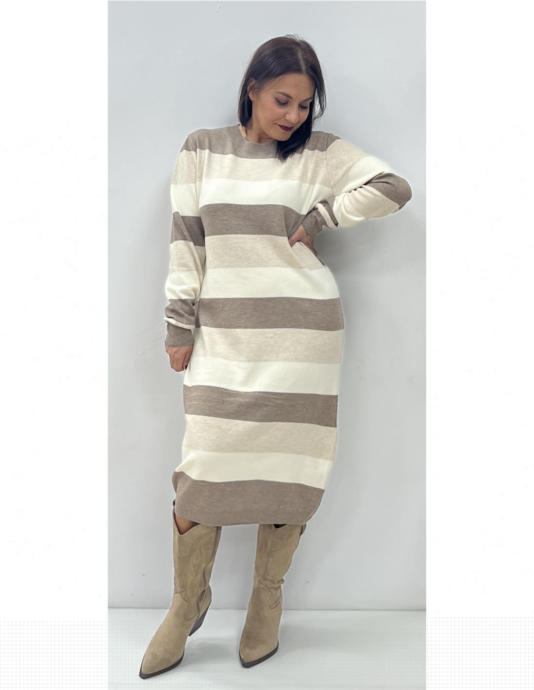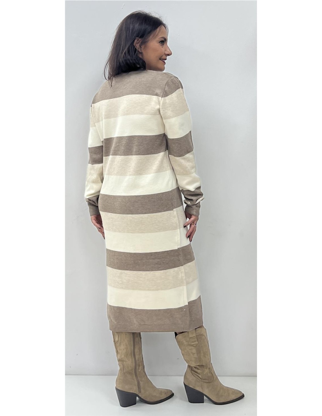 De punto de rayas anchas, corte middi. Su talla va desde 38 hasta 46. Combinado con el BT196.