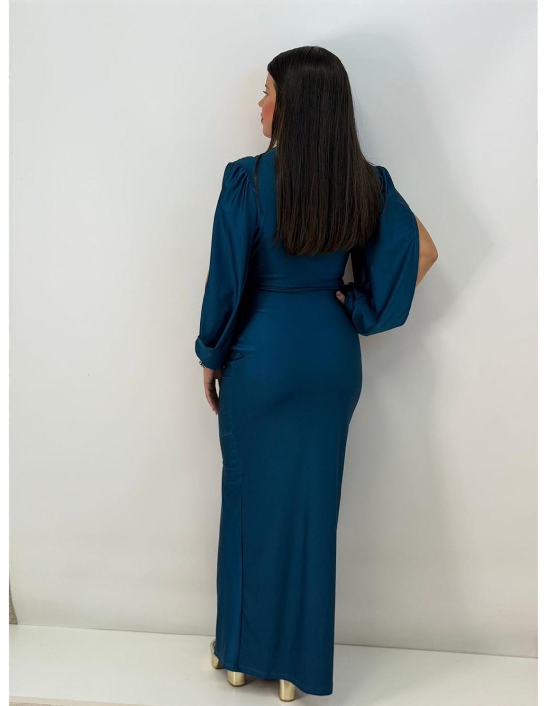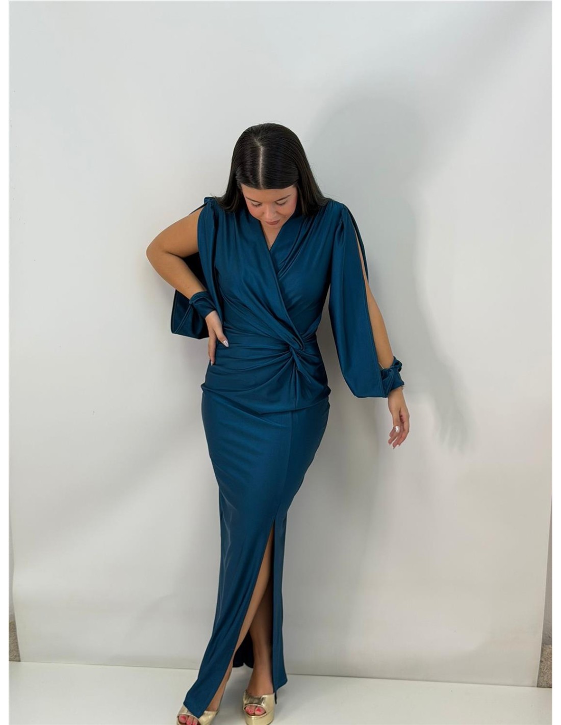 De licra fria, con mangas y abertura, nudo en la cintura. S u talla va desde una 36 hasta una 42 aproximadamente.