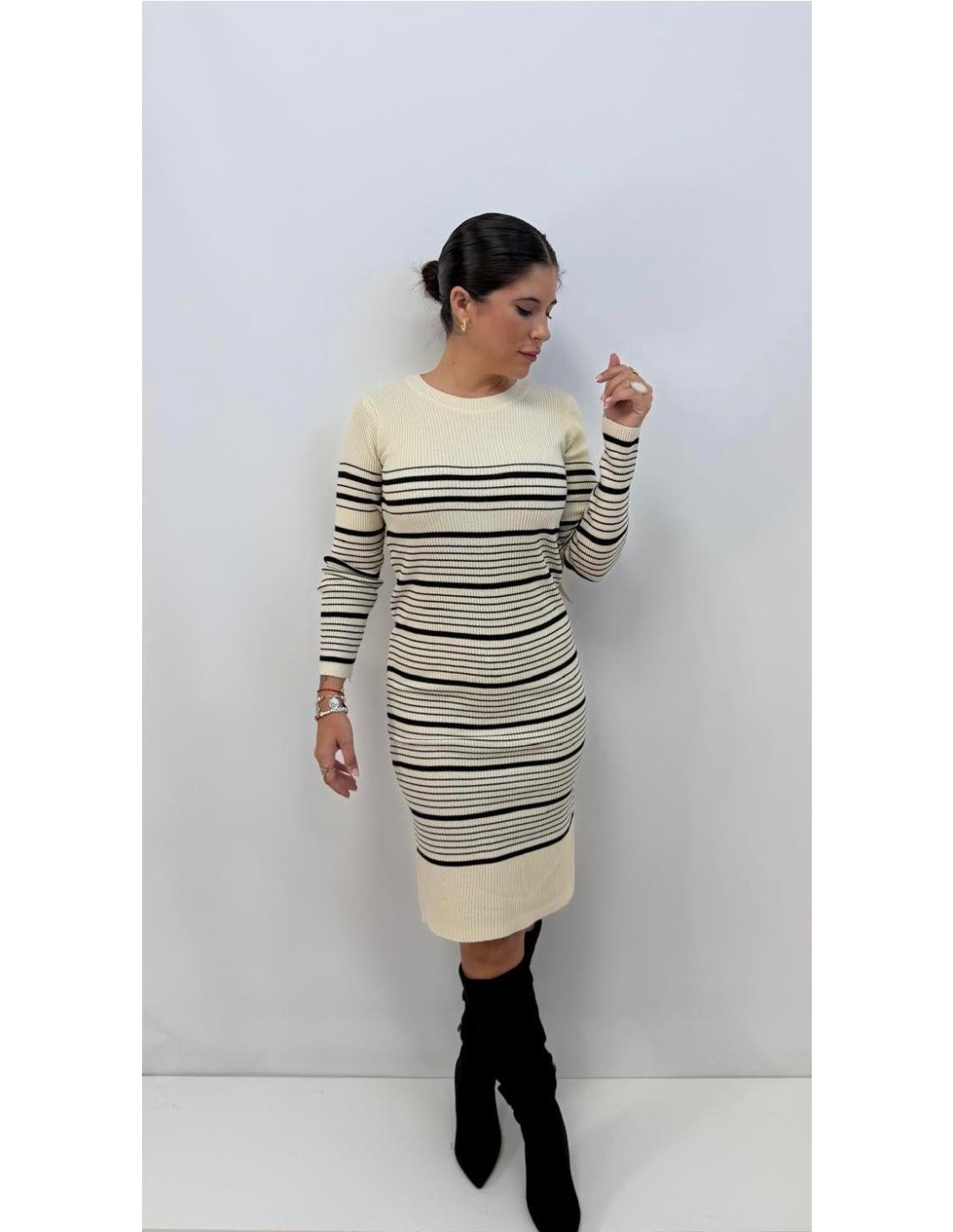 Vestido de canale con cuello a la caja, corte middi. Estampado de rayas. Su talla va desde una 34 hasta una 44 aproximadamente.