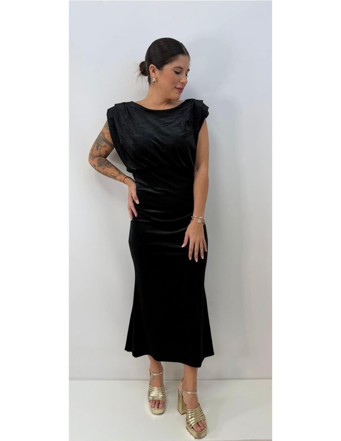 De tercioeplo, corte middi, con hombreras, manga a la siza. Su talla va desde una 36 hasta una 42 aproximadamente.