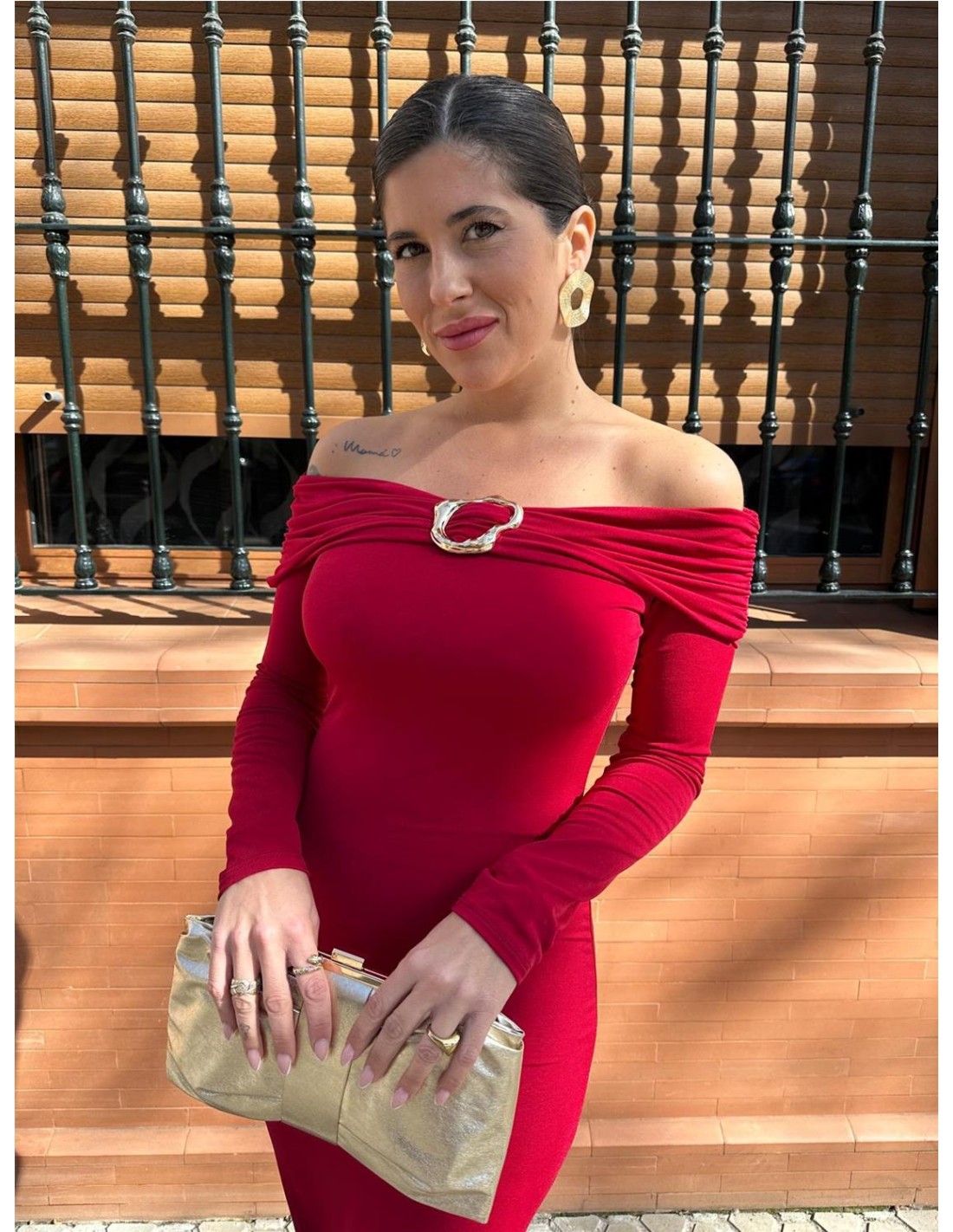 De crepe, con licra, palabra de honor, corte middi, con broche dorado, mangas largas. Su talla va desde una 36 hasta una 42 aproximadamente.