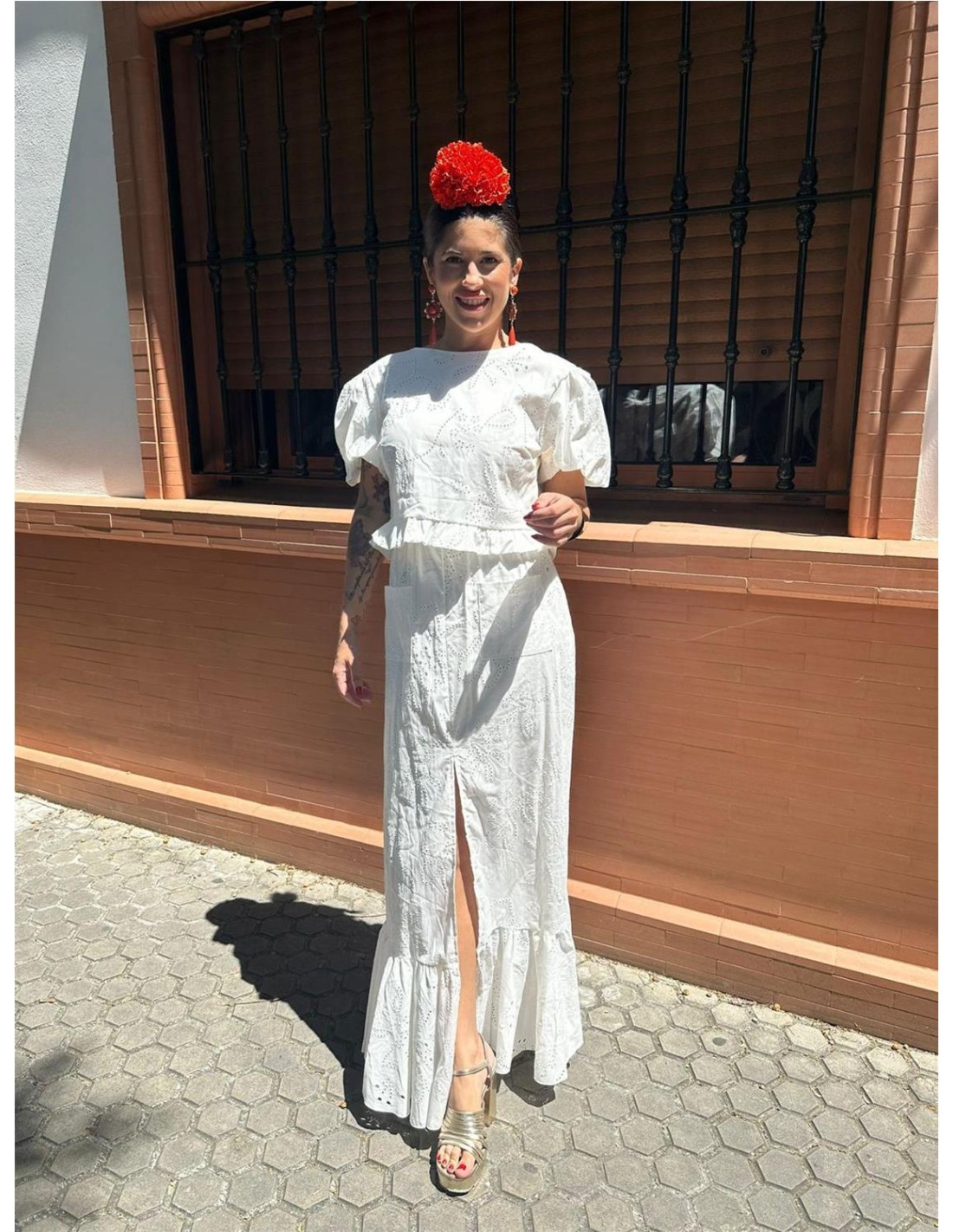 Conjunto de dos piezas, perforado, cinturilla elástica. Su talla puede dar desde una 36 hasta una 40 aproximadamente.