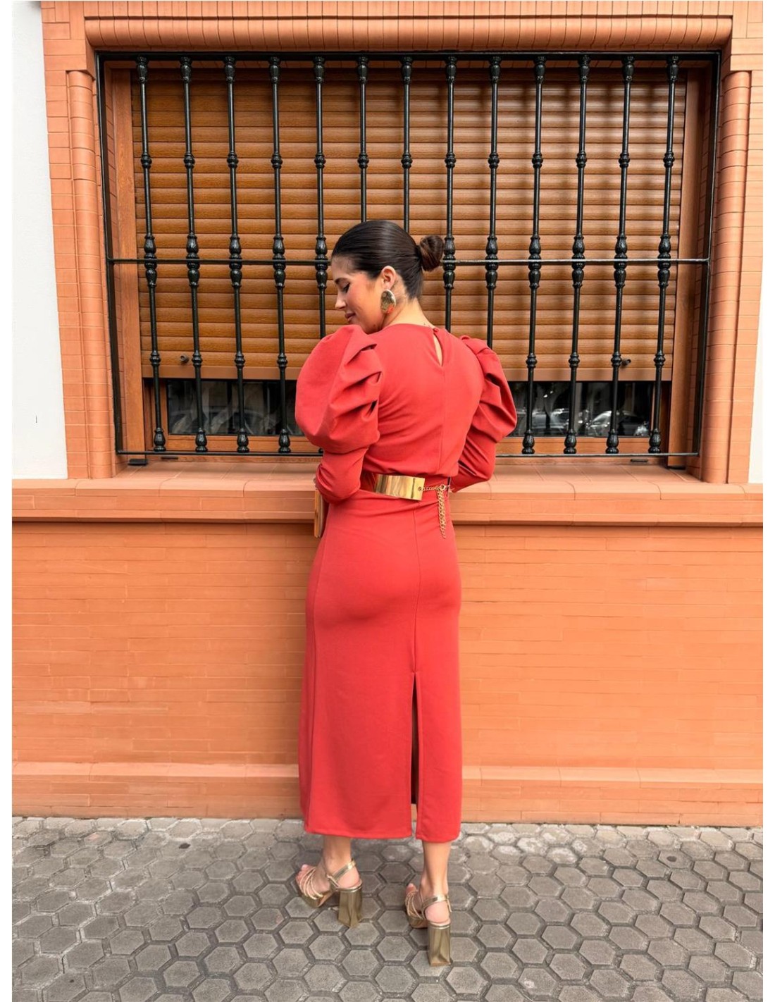 VESTIDO DE CREPE CON ELASTAN, MANGAS ABULLONADAS. TALLA UNICA DE 34 A 40 APROX