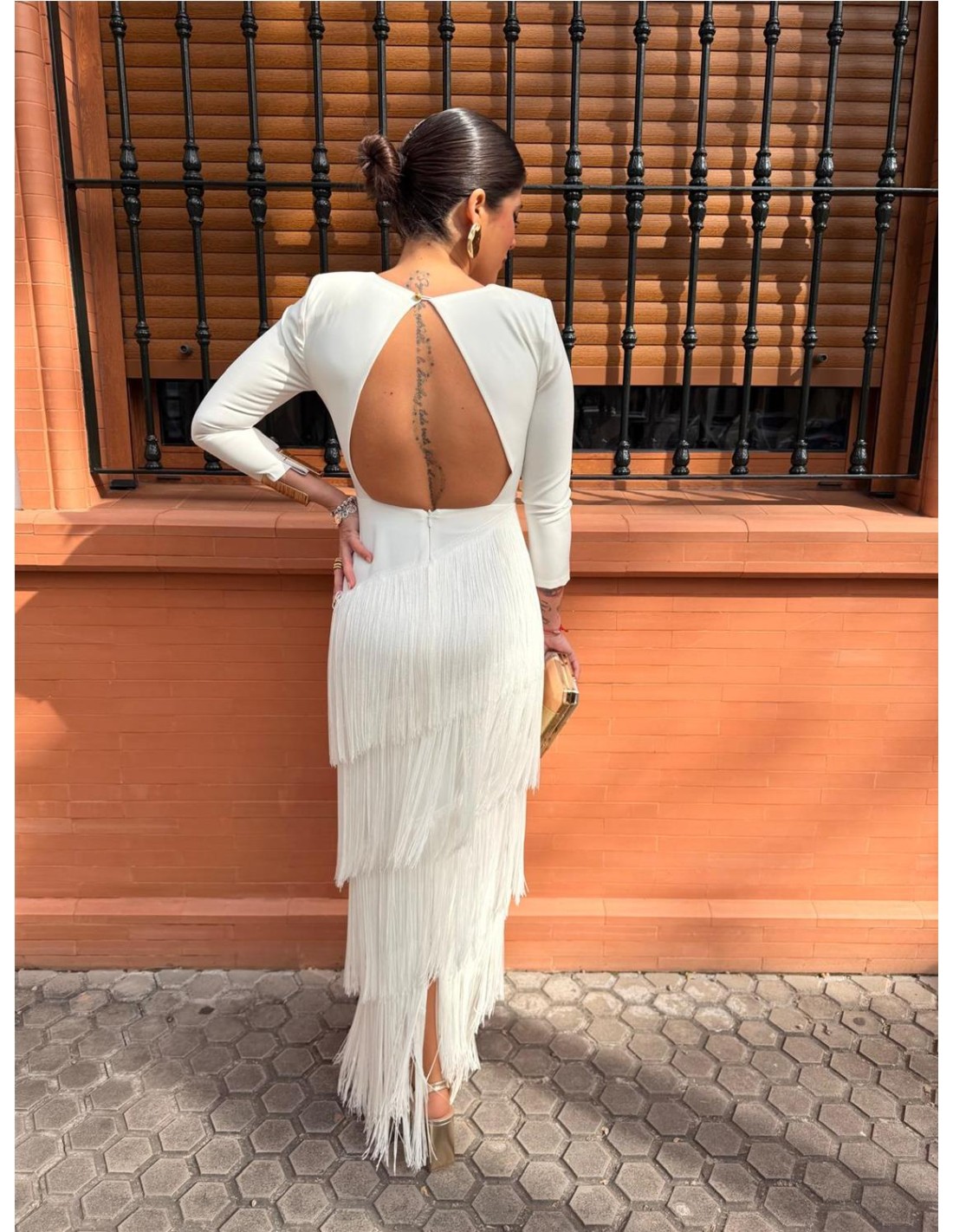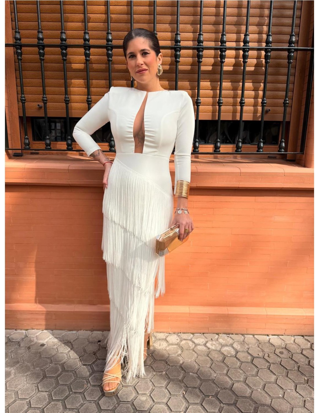 Vestido con flecos,corte middi, cremallera trasera, hombreras, con abertura trasera. Tallas S:34/36, M:36/38, L:38/40 y L:40/42 aproximadamente.
