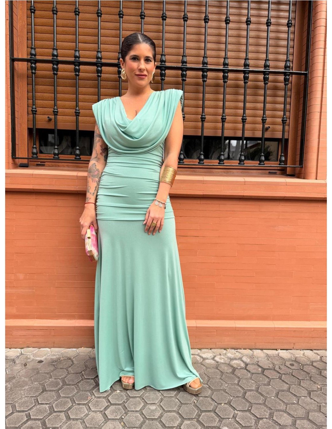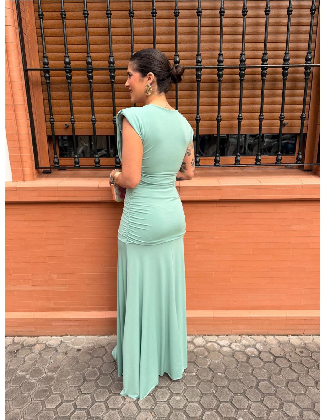 Vestido de licra, con hombreras y drapeado, largo. Talla única desde una 34 hasta una 42 aproximadamente.