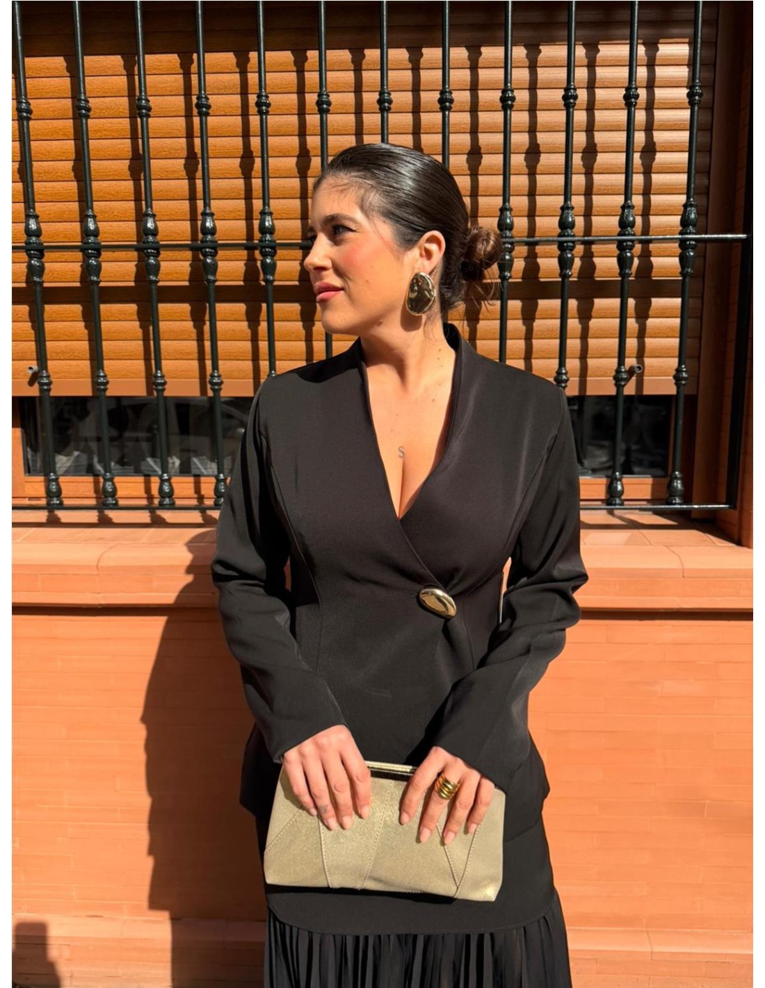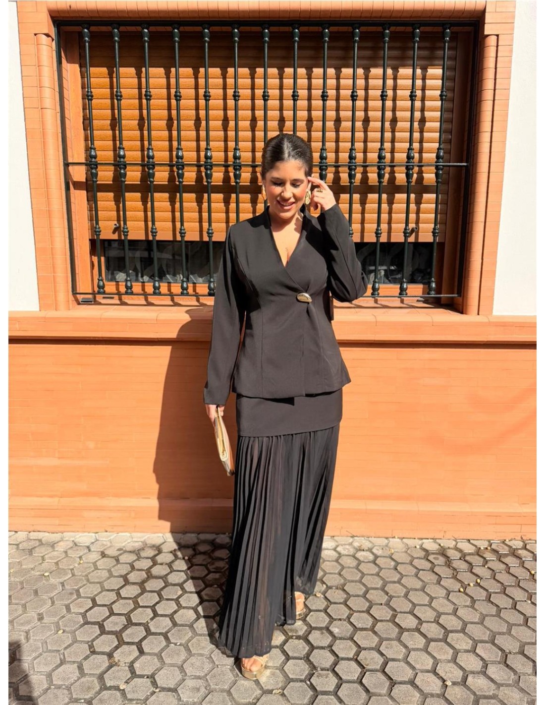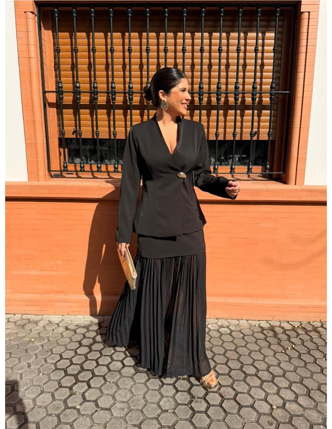 Conjunto de dos piezas, chaqueta de mangas largas, y falda plisada larga. Tallas S/M: 36/38 Y L/XL: 40/42 aproximadamente.