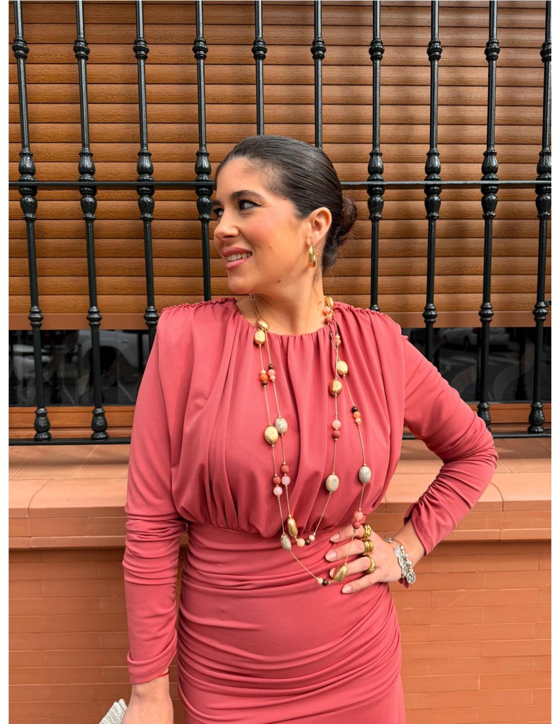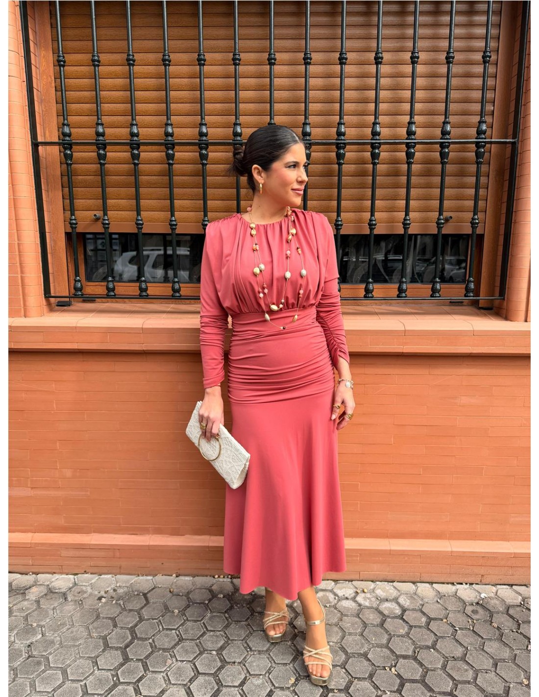 Vestido de crepe con elastan, mangas largas y con hombreras, fruncido en la barriga. Talla única desde una 34/36 hasta una 42 aproximadamente.