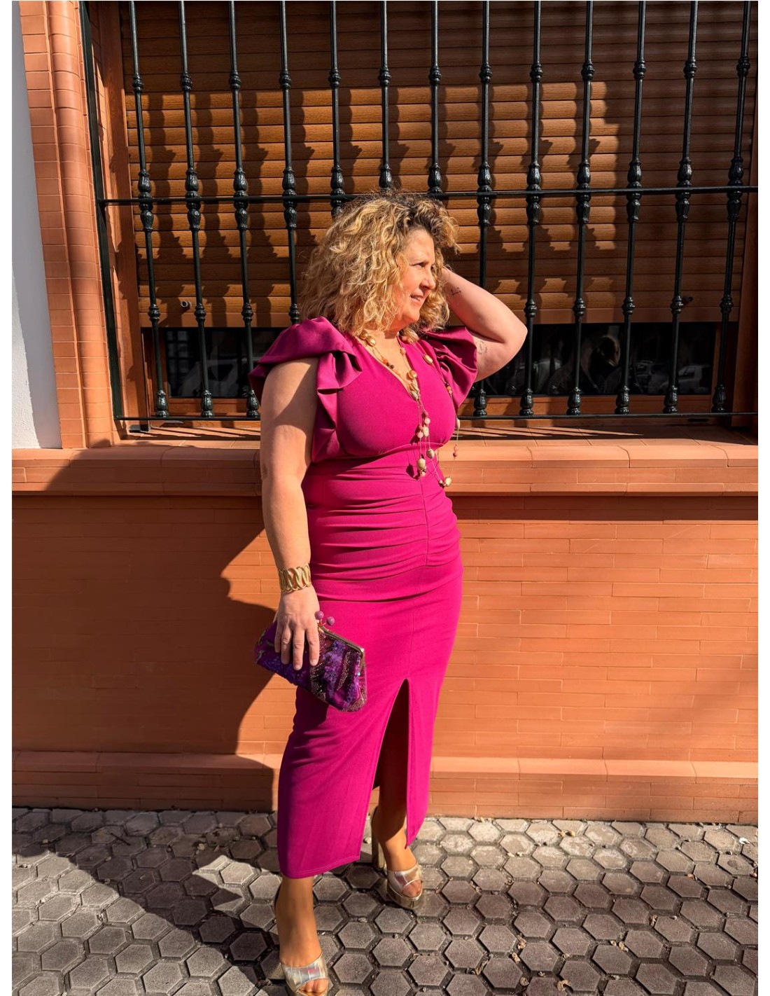 Vestido de crepe con elastan, con frunze en el abdomen, manga a la siza con volante. Talla única desde una 36 hasta una 42 aproximadamente.