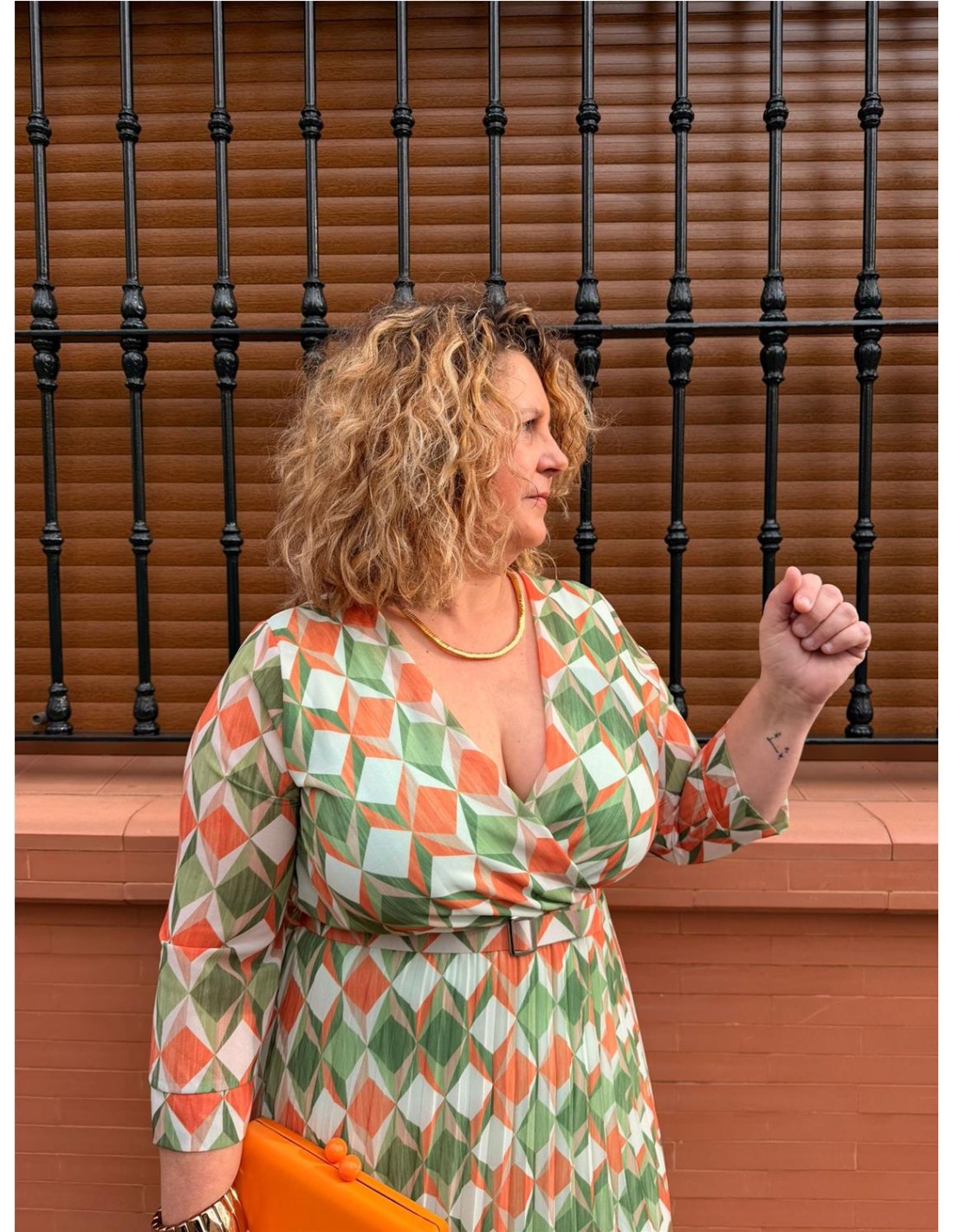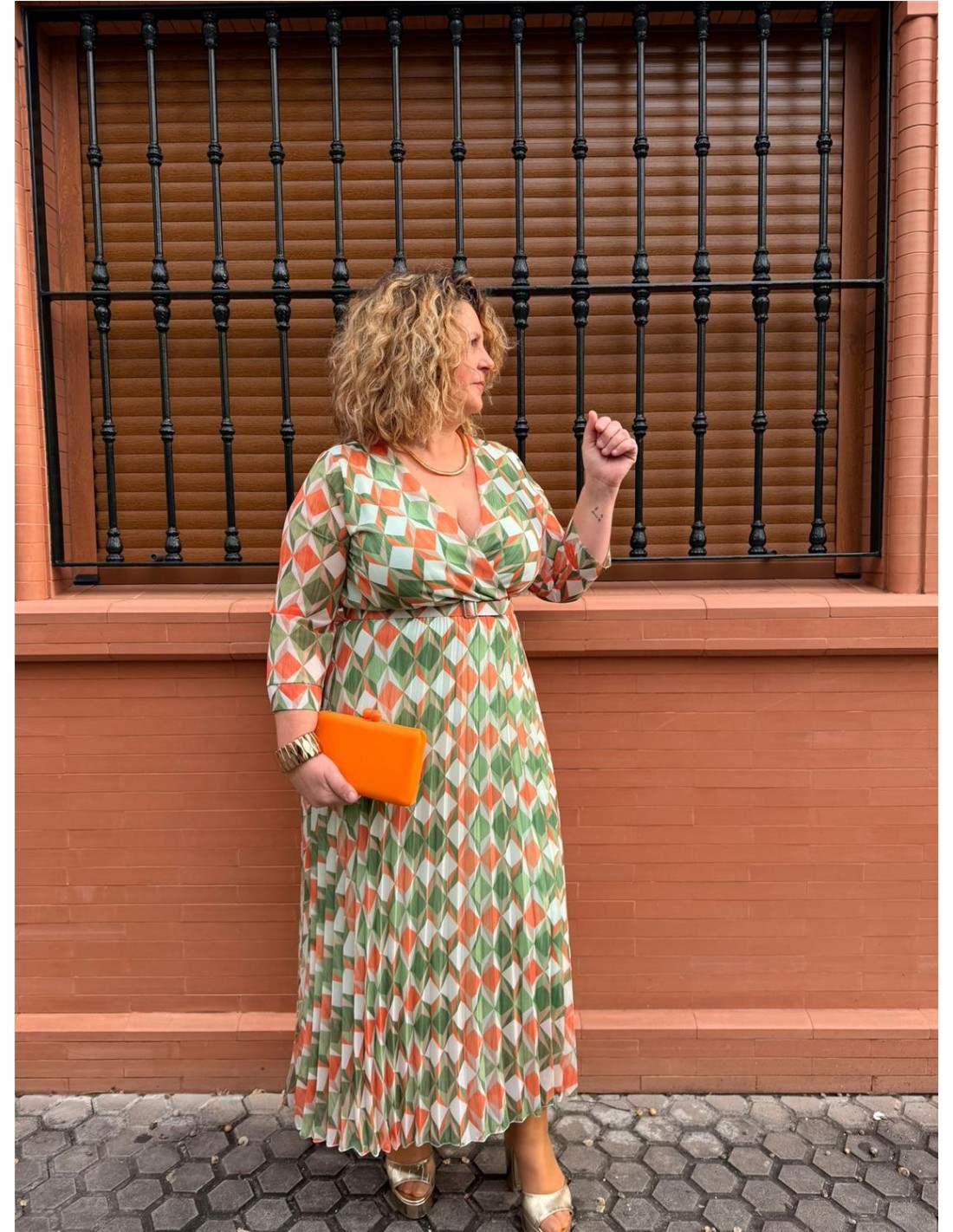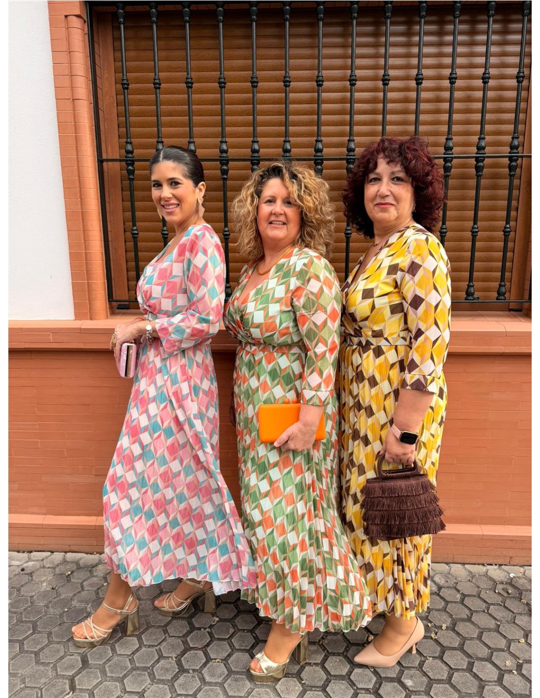 Vestido de gasa con rombos, media mmanga, corte middi, con escote. Talla única desde ujna 36 hasta una 44/46 aproximadamente.