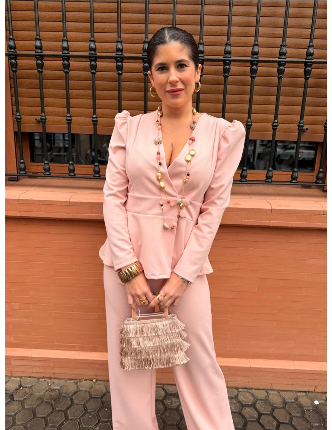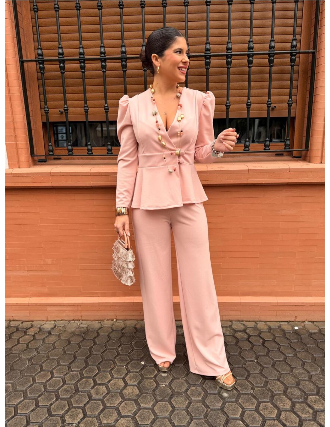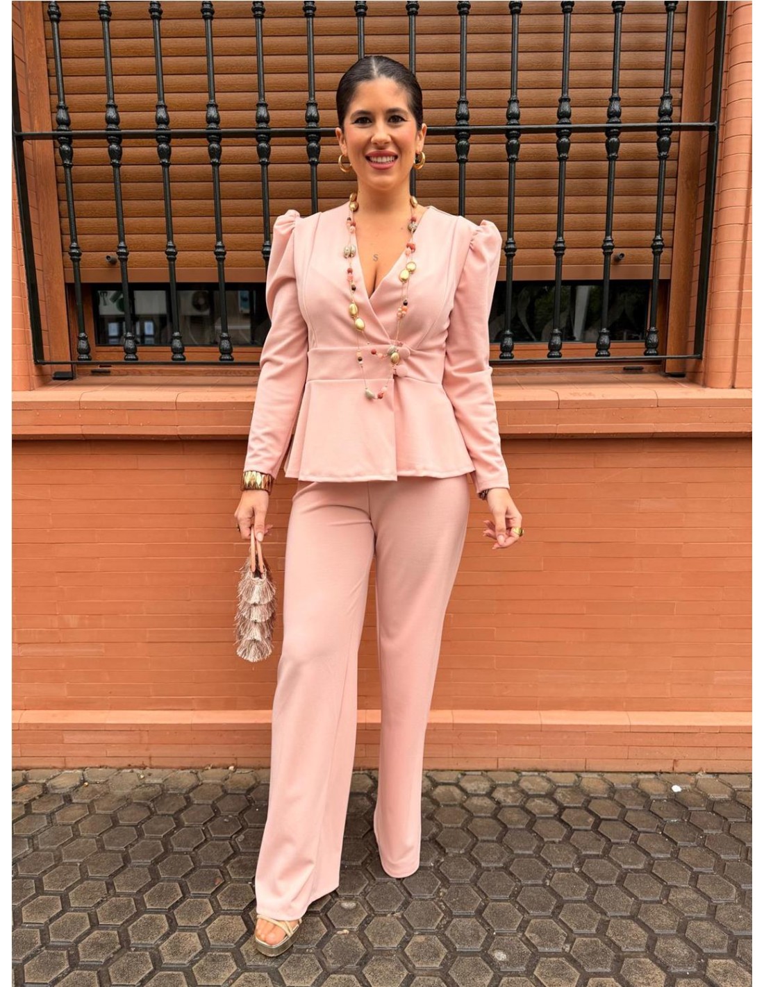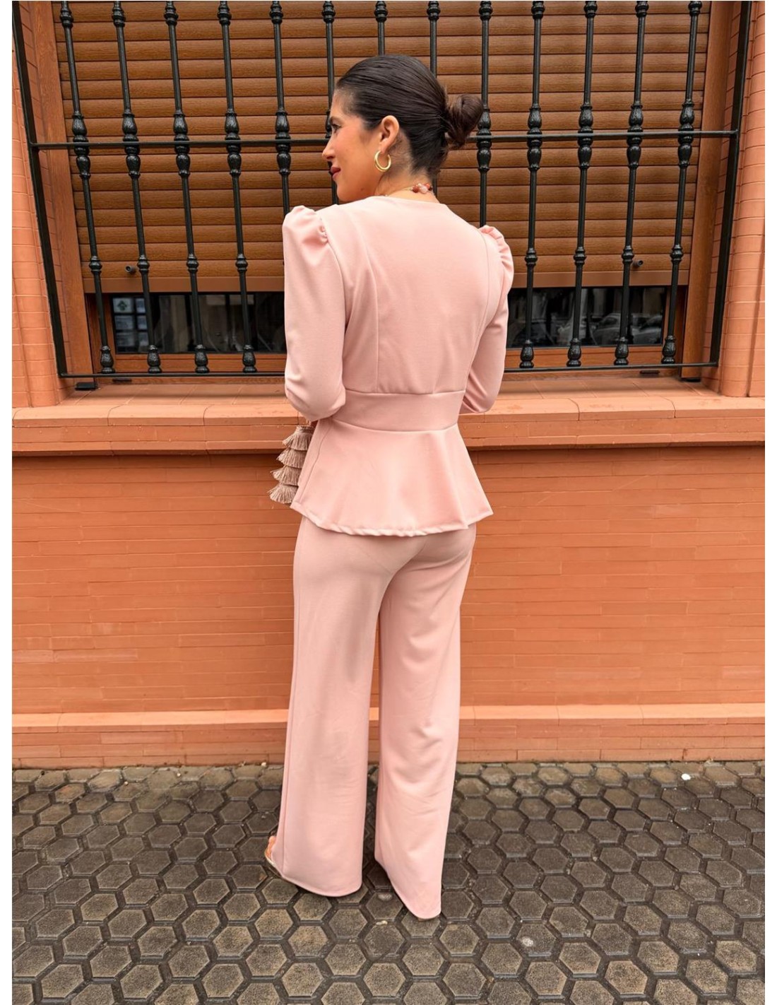 Conjunto dos piezas, chaqueta mangas largas abotonada, y pantalón pata elefante. Talla única desde una 36 hasta una 42 aproximadamente.
