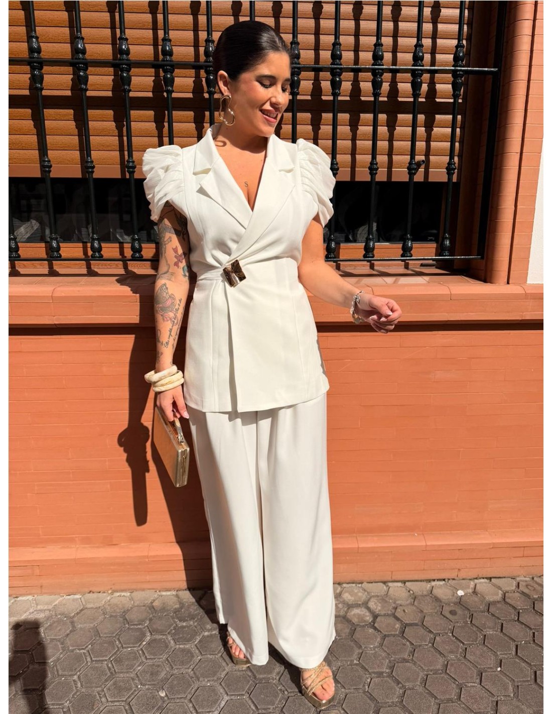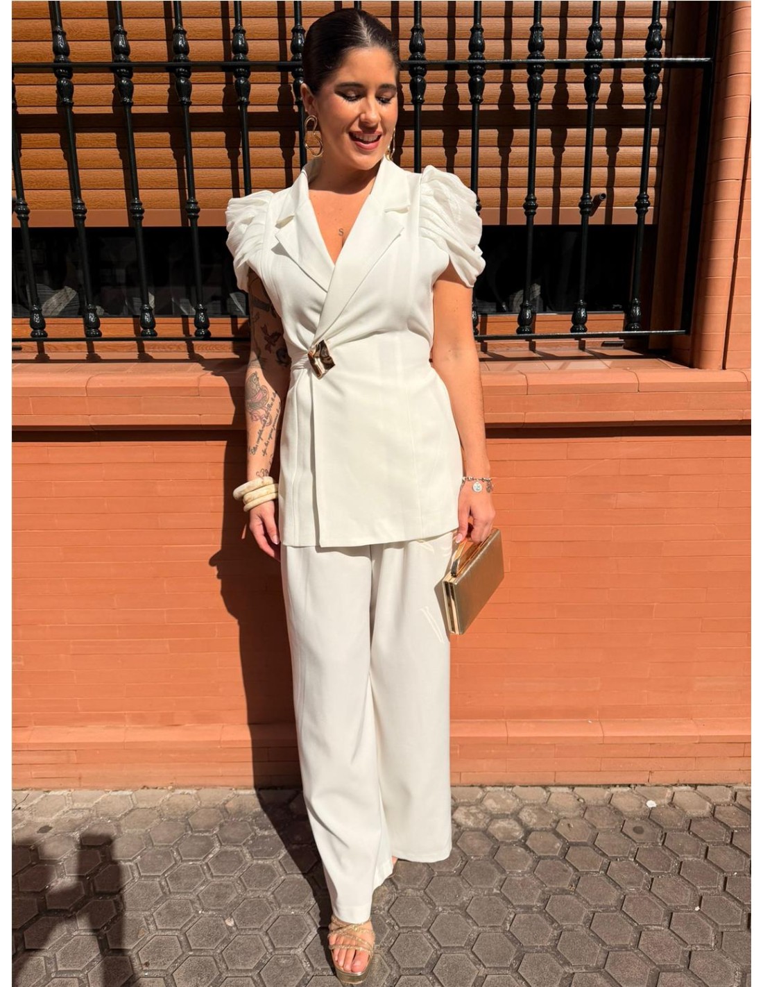 Conjunto de dos piezas, de crepe con elastan y broche dorado. Talla única desde una 34/36 hasta una 42 aproximadamente.